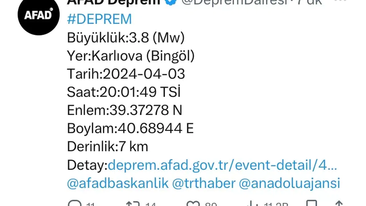 AFAD’dan yapılan açıklamaya göre, merkez üssü Karlıova ilçesinde saat 20.01’de 3.8 büyüklüğünde deprem meydana geldi. Yerin 7 kilometre derinliğinde meydana gelen depremde herhangi bir olumsuzluğun yaşanmadığı öğrenildi.