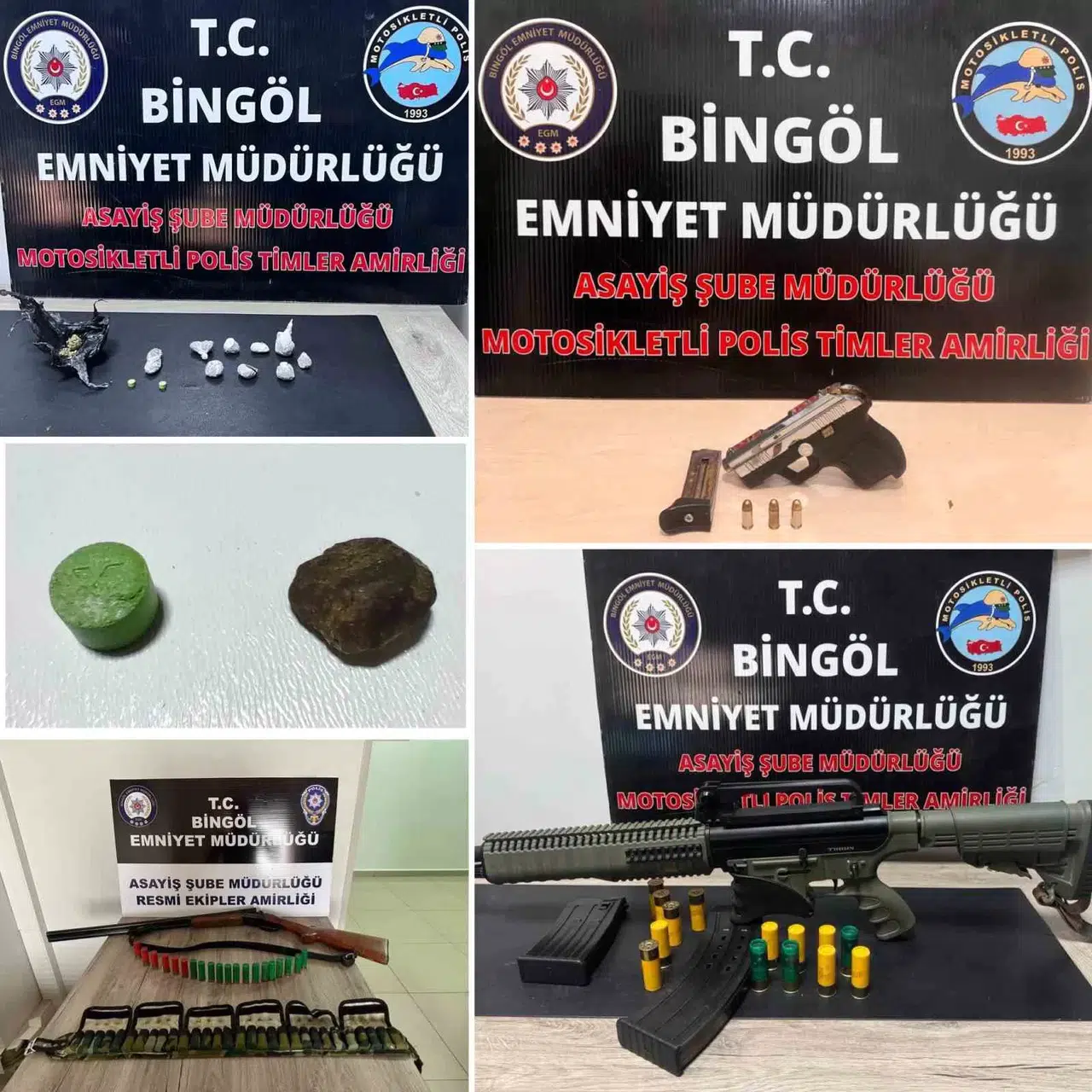 Bingöl İl Emniyet Müdürlüğü tarafından yapılan açıklamada, ’’Asayiş Şube Müdürlüğü görevlilerimizce 8-12 Şubat 2024 tarihleri arasında yapılan çalışmalarda, 818 şahıs sorgulanmış, 402 araç sorgulanmış, 4 adet ruhsatsız tabanca, 1 adet av tüfeği, 1 adet kurusıkı tabanca, 43 adet fişek, 17 adet av tüfeğine ait kartuş, 16,16 gram esrar maddesi, 4 adet extasy uyuşturucu hap, ele geçirildi. Ayrıca, 3 yıl 1 ay 15 gün kesinleşmiş hapis cezası olan 1 şahıs, 2 yıl 3 ay kesinleşmiş hapis cezası olan 1 şahıs, aranma kaydı olan 1 şahıs olmak üzere toplamda 3 şahıs yakalanmıştır. Vatandaşlarımızın can ve mal güvenliğinin korunması, asayişin huzur ve temini için tüm ekiplerimiz cansiperhane şekilde büyük duyarlılıkla görevlerini sürdürmektedir" denildi.