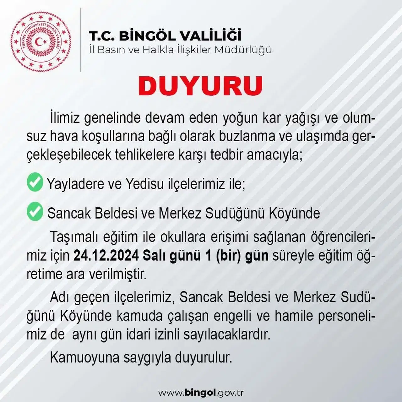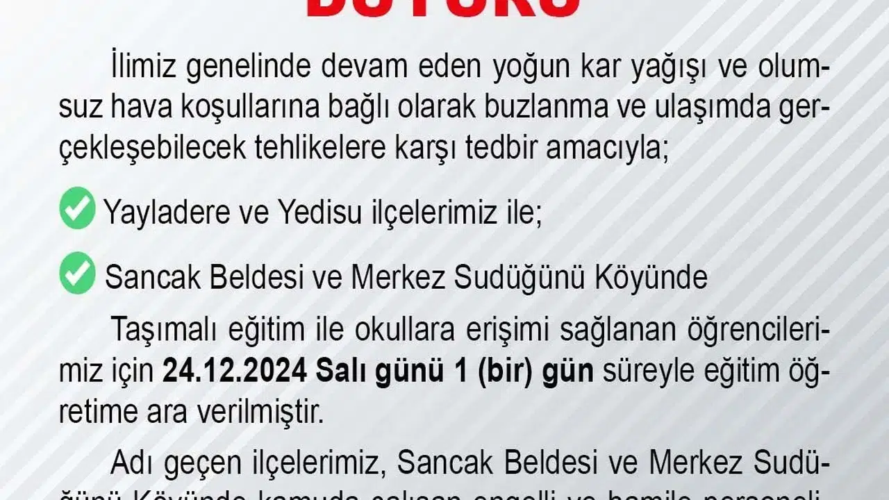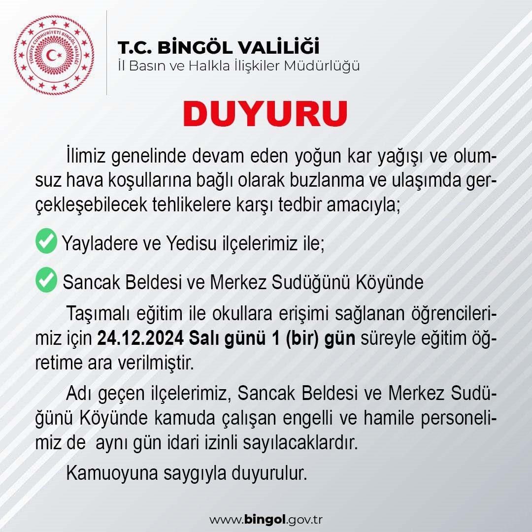 Bingöl Valiliği’nden yapılan açıklamada, “İlimiz genelinde devam eden yoğun kar yağışı ve olumsuz hava koşullarına bağlı olarak buzlanma ve ulaşımda gerçekleşebilecek tehlikelere karşı tedbir amacıyla Yayladere ve Yedisu ilçelerimiz ile Sancak beldesi ve merkez Sudüğünü köyünde taşımalı eğitim ile okullara erişimi sağlanan öğrencilerimiz için 24.12.2024 Salı günü 1 gün süreyle eğitim öğretime ara verilmiştir. Adı geçen ilçelerimiz, Sancak beldesi ve Merkez Sudüğünü köyünde kamuda çalışan engelli ve hamile personelimiz de aynı gün idari izinli sayılacaklardır” denildi.
