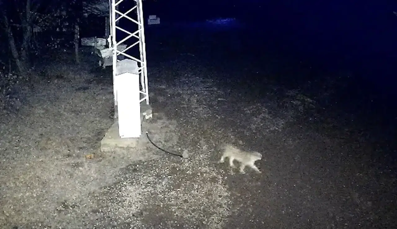 O anlar ise ilçedeki güvenlik kameralarına yasıdı. Görüntülerde, vaşağın yolda yürüdüğü ve daha sonra bir işletmenin bahçesine girdiği görülüyor. Farklı bir kameraya yansıyan görüntüde ise vaşak etrafı gözlemleyerek yürüyor.