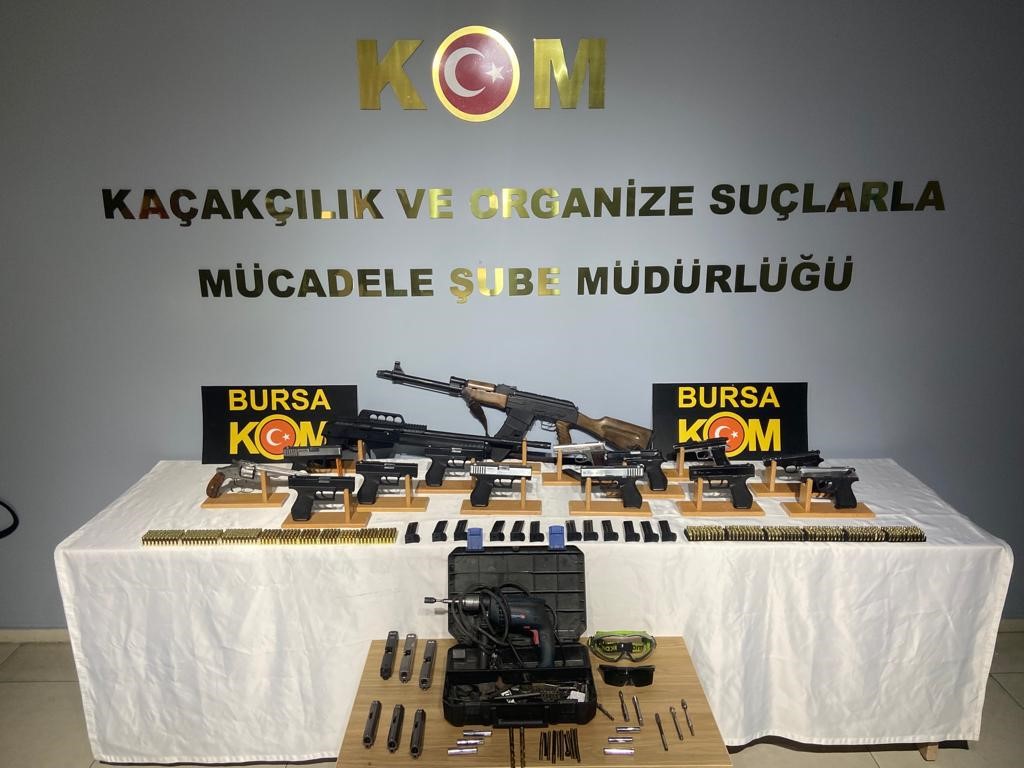Kaçakçılık ve Organize Suçlarla Mücadele Şube Müdürlüğü ekipleri, merkez Osmangazi ilçesinde Ö.A. ve M.A. isimli şahısların il dışından temin ettikleri kuru sıkı tabancalara atış kabiliyeti kazandırarak piyasada sattıklarını tespit etti. Ö.A. ve M.A.’nın ev ve işyerlerinde yapılan aramada; 13 adet ruhsatsız tabanca, 2 adet av tüfeği, 673 adet 9x19 fişek, 35 adet şarjör, 9 adet işlem görmüş kuru sıkı namlusu, 6 adet sürgü kapağı, 9 adet icra yayı, 3 adet icra mili, 1 adet matkap ve 8 adet namlu ucu açılmasında kullanılan çeşitli malzemeler ele geçirildi. Şüphelilerden M.A., ifadesi alındıktan sonra serbest bırakılırken, Ö.A. ise gözaltına alınarak adli tahkikatının sürdüğü öğrenildi.
