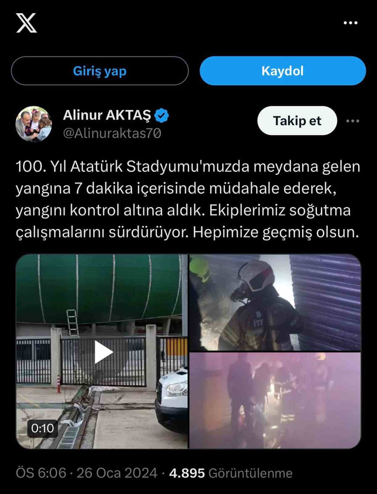 Bursa Büyükşehir Belediye Başkanı Alinur Aktaş, sosyal medya hesabından yaptığı açıklamada, "100. Yıl Atatürk Stadyumu’muzda meydana gelen yangına 7 dakika içerisinde müdahale ederek, yangını kontrol altına aldık. Ekiplerimiz soğutma çalışmalarını sürdürüyor" dedi.
