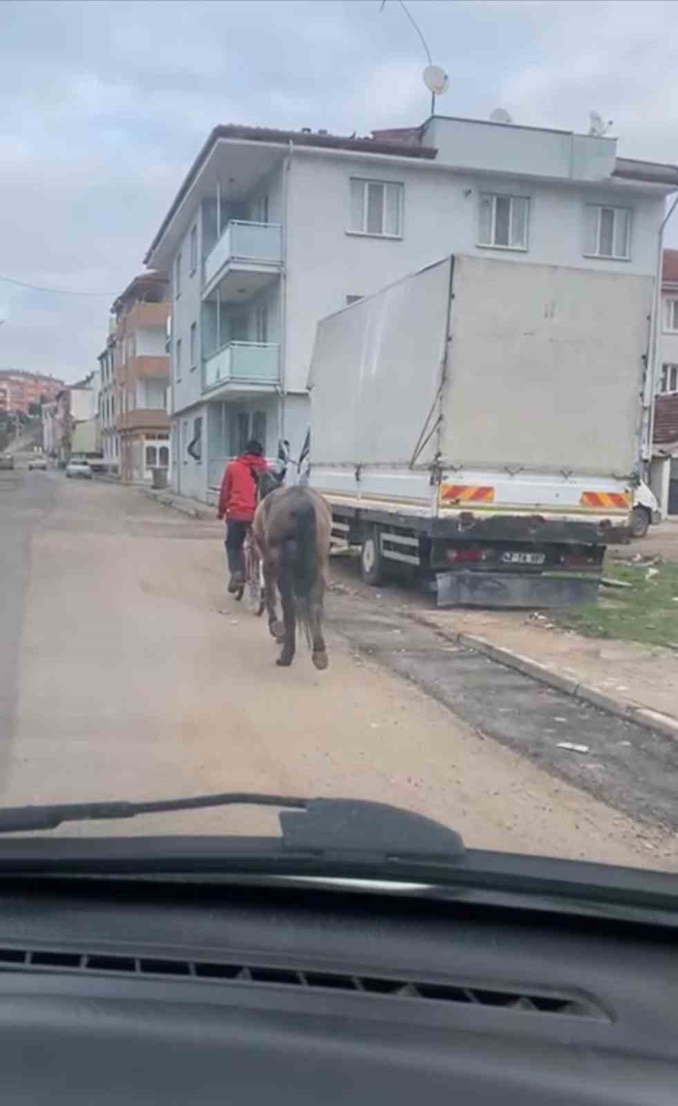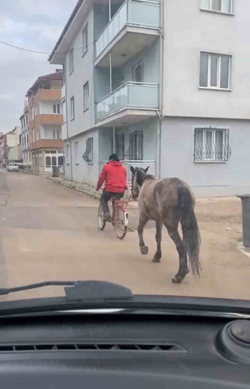 Bursa’nın İnegöl ilçesinde bisikletine atı bağlayarak götüren şahıs cep telefon kamerasına yansıdı.