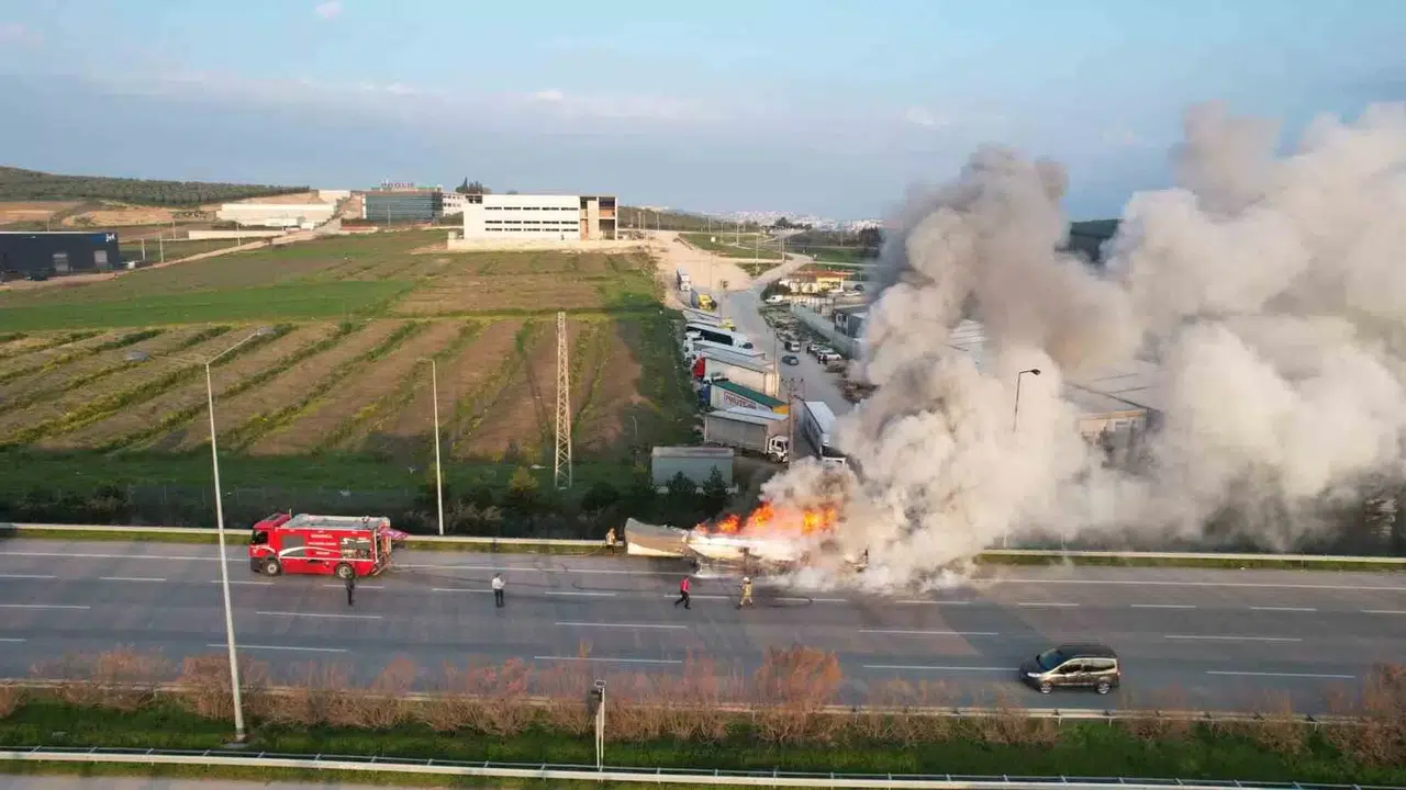 Bursa’da devrilen tırın dorsesi alev alev yanarken o anlar dron ile görüntülendi.