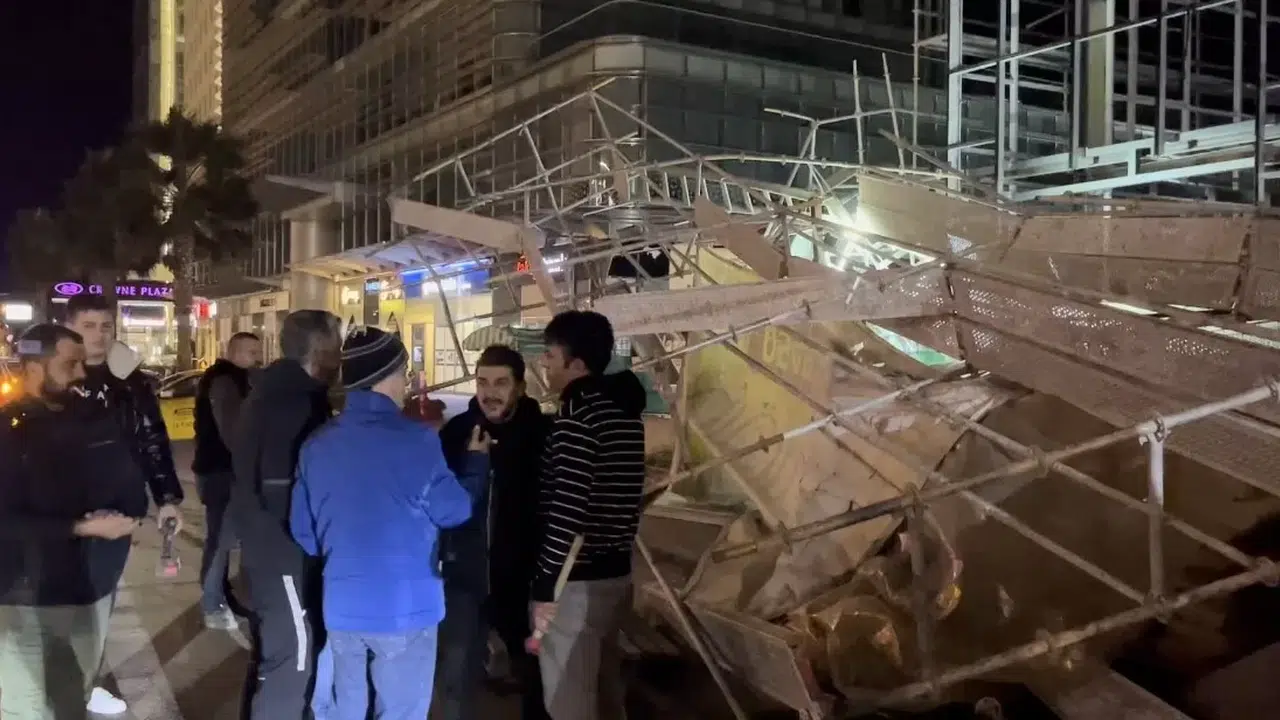 Bursa’da etkisini gösteren şiddetli rüzgâr inşaatı devam eden bir binanın iskelesini devirdi. Gece saatleri olması nedeniyle şans eseri yaralanan olmazken, fırtına ağaçları yerinden söktü, araçlar zarar gördü.