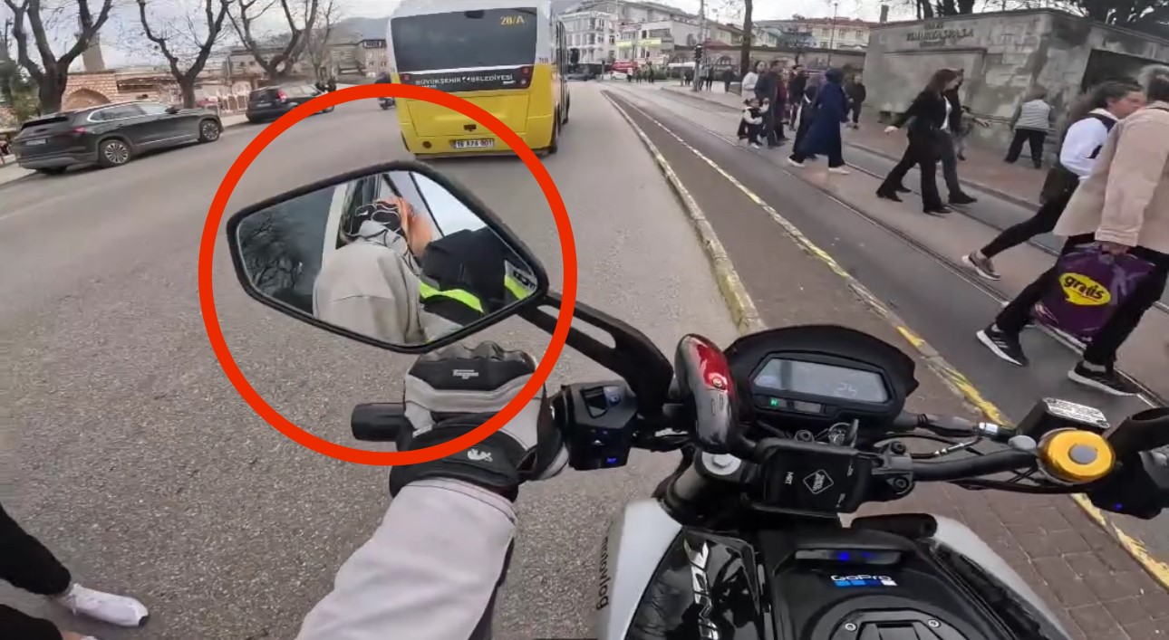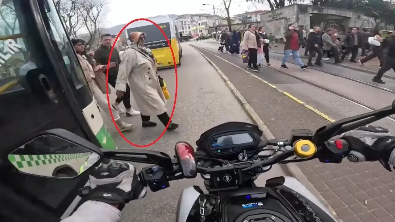 O esnada bir midibüsün önünden geçen yaya ile motosiklet sürücüsü gözgöze geldi. Muhtemel bir kaza, motosiklet sürücüsü Karakuş’un bir anlık refleksi sayesinde kıl payı önlendi.