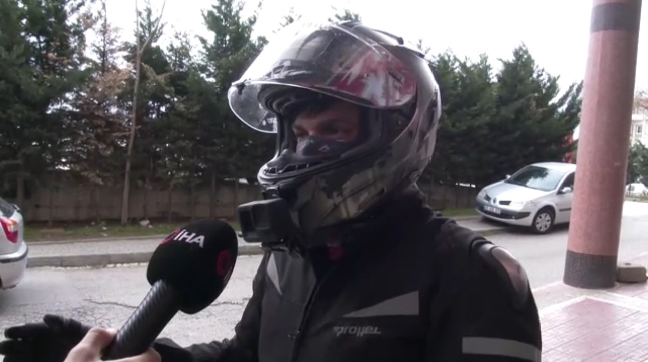 O anlar motosiklet sürücüsünün saniye saniye kask kamerasına yansıdı. O anları anlatan Mustafa K., "Ben de olayın şaşkınlığını yaşıyorum" dedi.