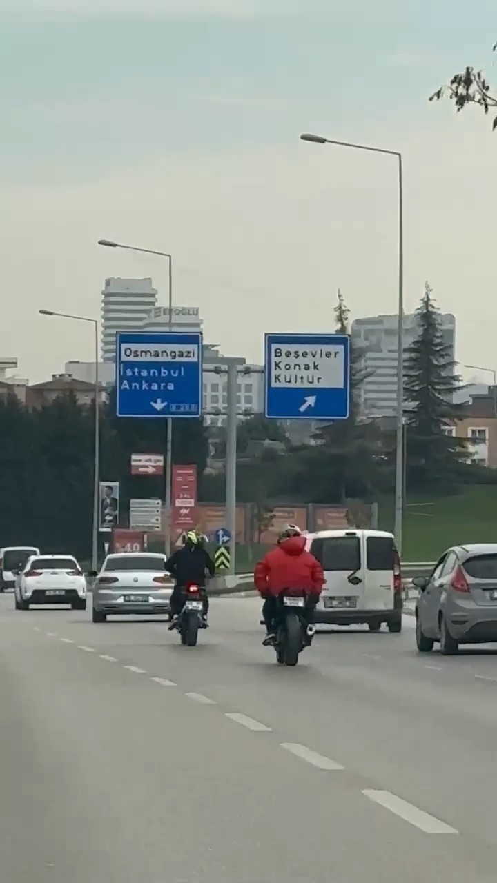 Bursa’da motosikletli gençlerin trafikteki tehlikeli hareketleri yürekleri ağza getirirken, o anlar kameraya yansıdı.