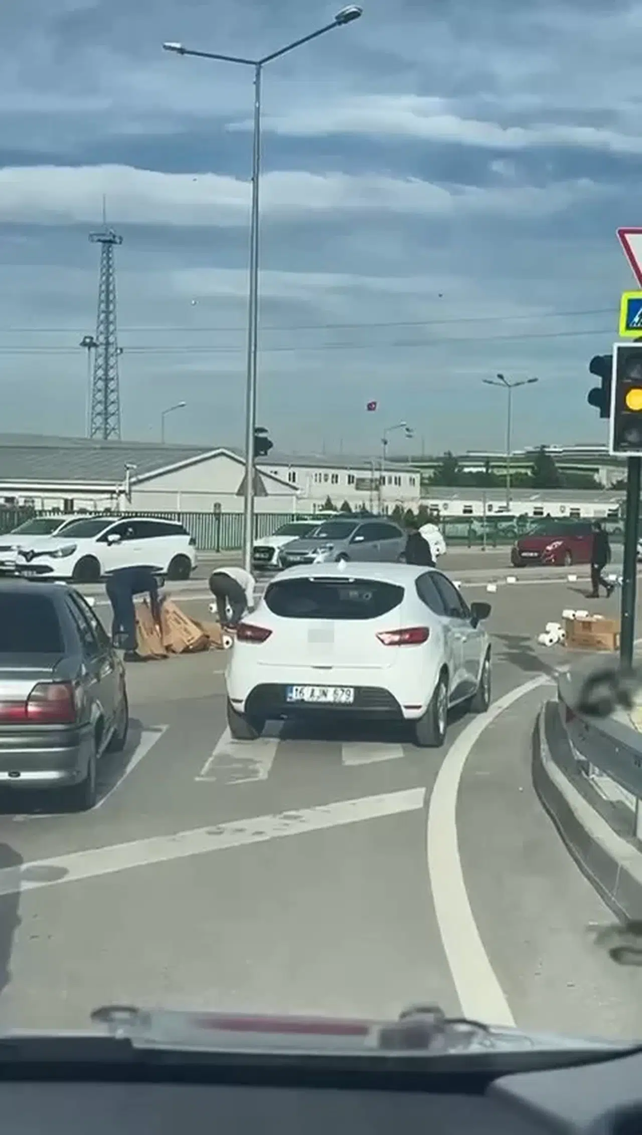 Bursa’da kamyonetin kasasından yere dökülen peçeteler için sürücüler seferber olurken, o anlar cep telefon kamerasına yansıdı.