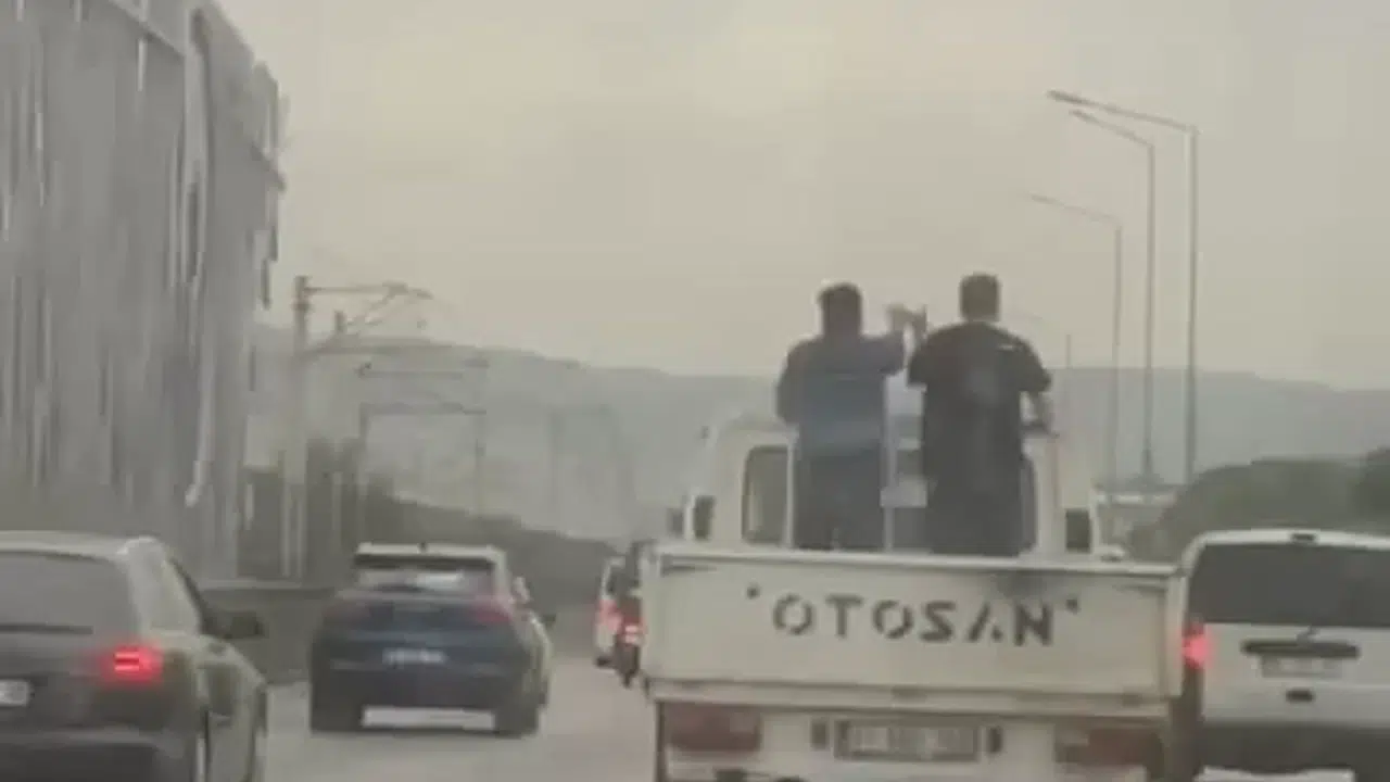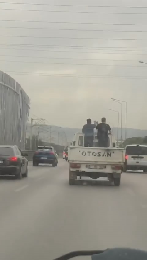 Bursa’da iki kafadarın kamyonet kasasındaki tehlikeli halayı başka bir sürücünün cep telefonu kamerasına yansıdı.