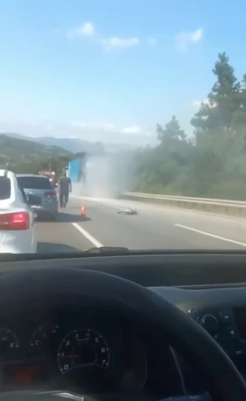 Olay, İnegöl-Bursa Yolu Dürdane Rampası üzerinde meydana geldi. Edinilen bilgiye göre, tır şoförü çıkan dumanları görünce emniyet şeridine park etti. Dumanlar bir süre sonra yerini alevlere bıraktı. Çevredeki vatandaşların ihbarı üzerine olay yerine itfaiye ve polis ekipleri sevk edildi. Yangın sebebiyle yoğun trafik oluştu. Yangın, itfaiye ekiplerinin müdahalesiyle söndürüldü. Yangında can kaybı meydana gelmezken, tırın dorsesinde maddi hasar oluştu.