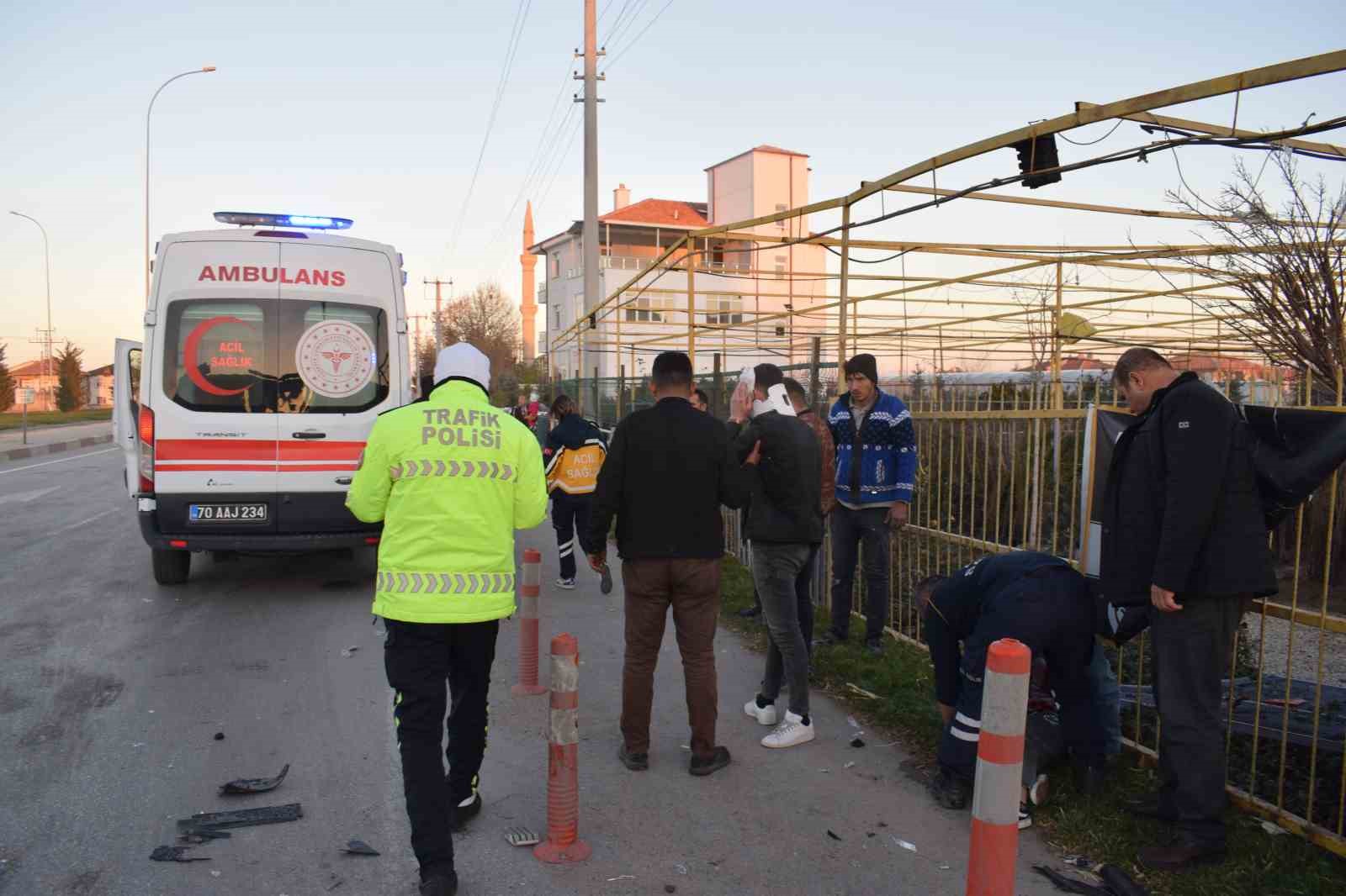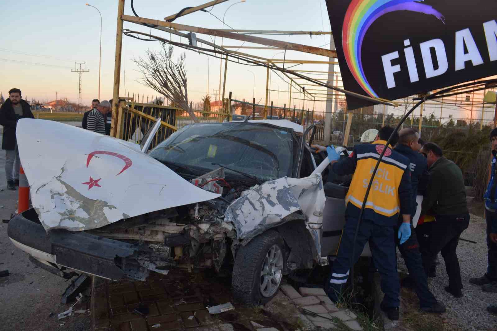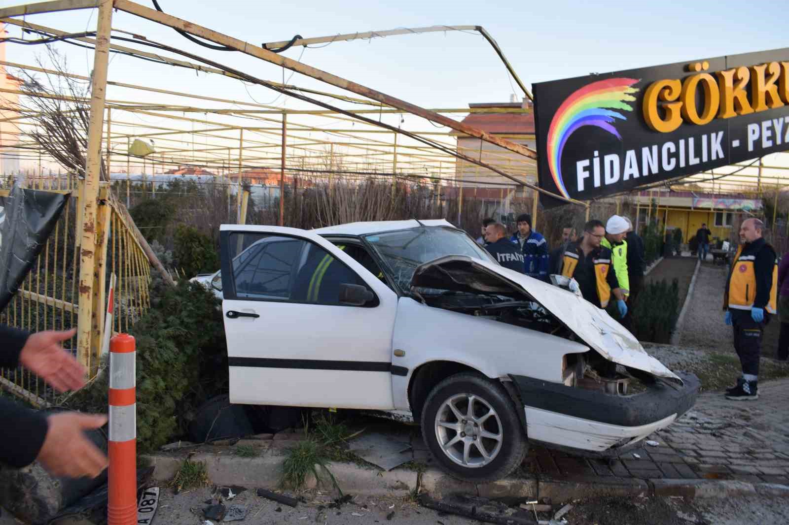 Karaman’da hafif ticari araçla otomobilin çarpıştığı kazada can pazarı yaşandı. Çarpışmanın şiddetiyle savrulan otomobil yol kenarındaki fidan satışı yapan iş yerine dalarken, o anlar kameraya yansıdı.