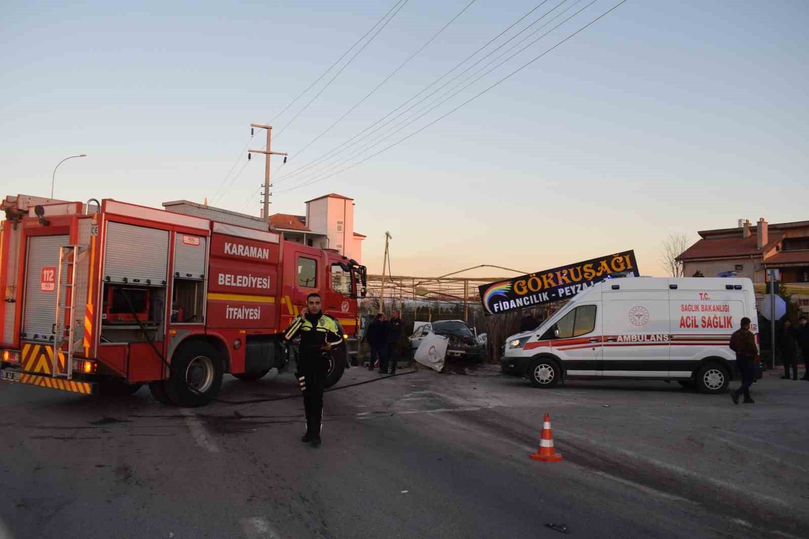 Kaza, Karaman-Ereğli Karayolu üzerindeki düğün salonlarının bulunduğu kavşakta yaşandı. Edinilen bilgiye göre, Karaman’dan Ereğli istikametine seyretmekte olan S.T. yönetimindeki 42 YA 087 plakalı otomobil, kavşakta dönüş yapmakta olan M.Y. idaresindeki 70 BH 919 plakalı hafif ticari araçla çarpıştı. Kaza sonrası kontrolden çıkan otomobil savrularak yol kenarındaki fidan satışı yapan iş yerine dalarken, o anlar güvenlik kamerasına yansıdı. İhbar üzerine kaza yerine sağlık, itfaiye ve polis ekipleri sevk edilirken, yaralıların yardımına ilk olarak çevredeki vatandaşlar koştu. Yardıma gelen bir vatandaş otomobilden dumanların çıktığını görerek aracın akü başlıklarını söktü. Olay yerine gelen itfaiye ekibi araçta sıkışan 1 kişiyi kurtararak sağlık ekiplerine teslim etti. Aynı otomobilde bulunan yaralı 3 kişi, kaza yerine gelen ambulanslarla kaldırıldıkları Karaman Eğitim ve Araştırma Hastanesinde tedavi altına alındı.