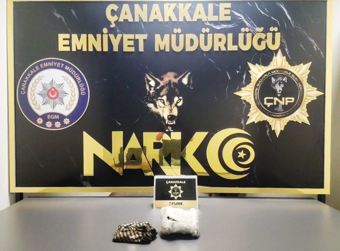 Çanakkale İl Emniyet Müdürlüğü Narkotik Suçlarla Mücadele Şube Müdürlüğü ekiplerince düzenlenen operasyonda şüpheli E.K.’nin üst ve araç aramasında 544,47 gram skunk ele geçirildi.