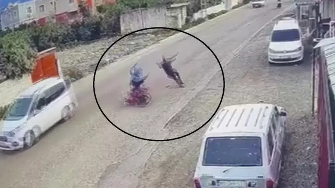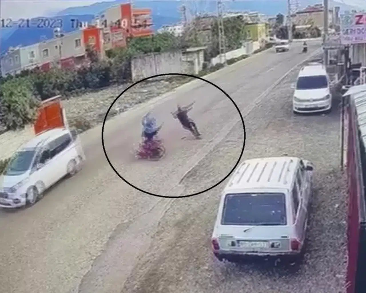 Hatay’ın Dörtyol ilçesinde meydana gelen kazada, motosiklet sürücüsünün ve çarptığı yayanın havaya uçma anı kameraya yansıdı.