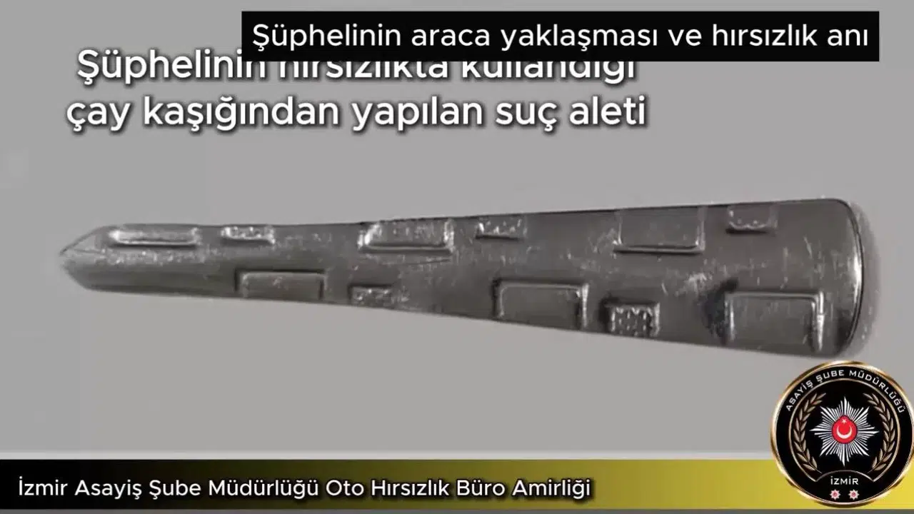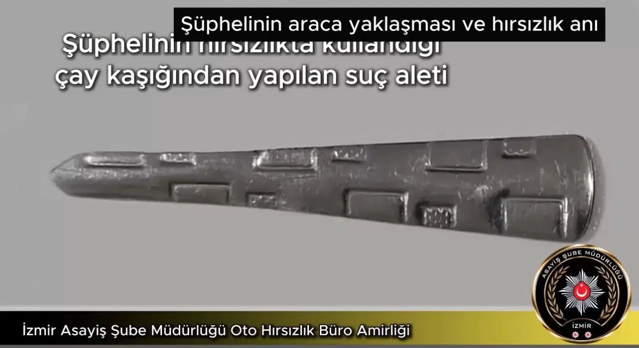 İzmir Asayiş Şube Müdürlüğü Oto Hırsızlığı Büro Amirliği ve Suç Analiz Büro Amirliği ekipleri, 28 Eylül günü Konak ilçesinde meydana gelen otomobil hırsızlığı ile ilgili çalışma gerçekleştirdi. Olay hakkında teknik ve fiziki takip yürüten ekipler, olayı gerçekleştiren şüphelinin İ.C. olduğunu ve araçları çalıştırmak için çay kaşığından kendisine özel bir aparat ürettiğini tespit etti. Kısa sürede yakalanan çay kaşıklı zanlı, gözaltına alınarak emniyete götürüldü.