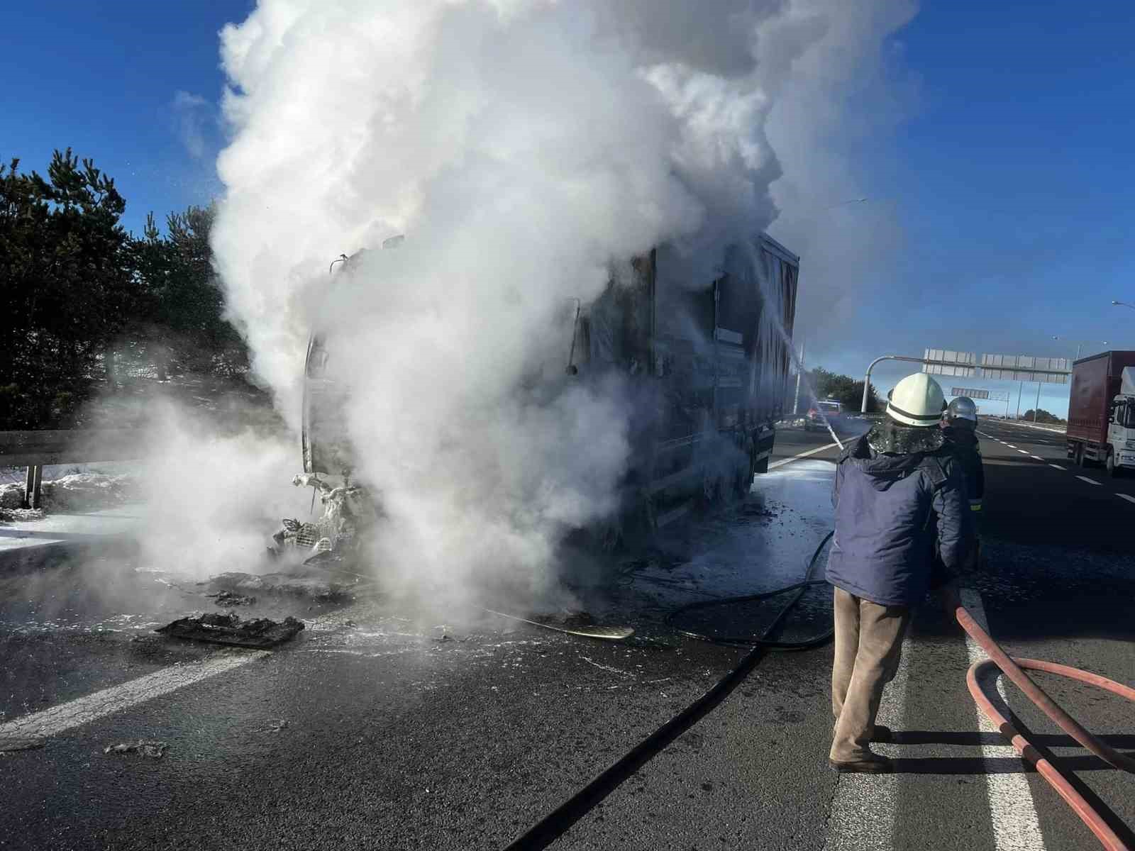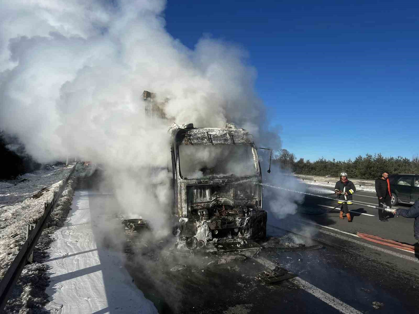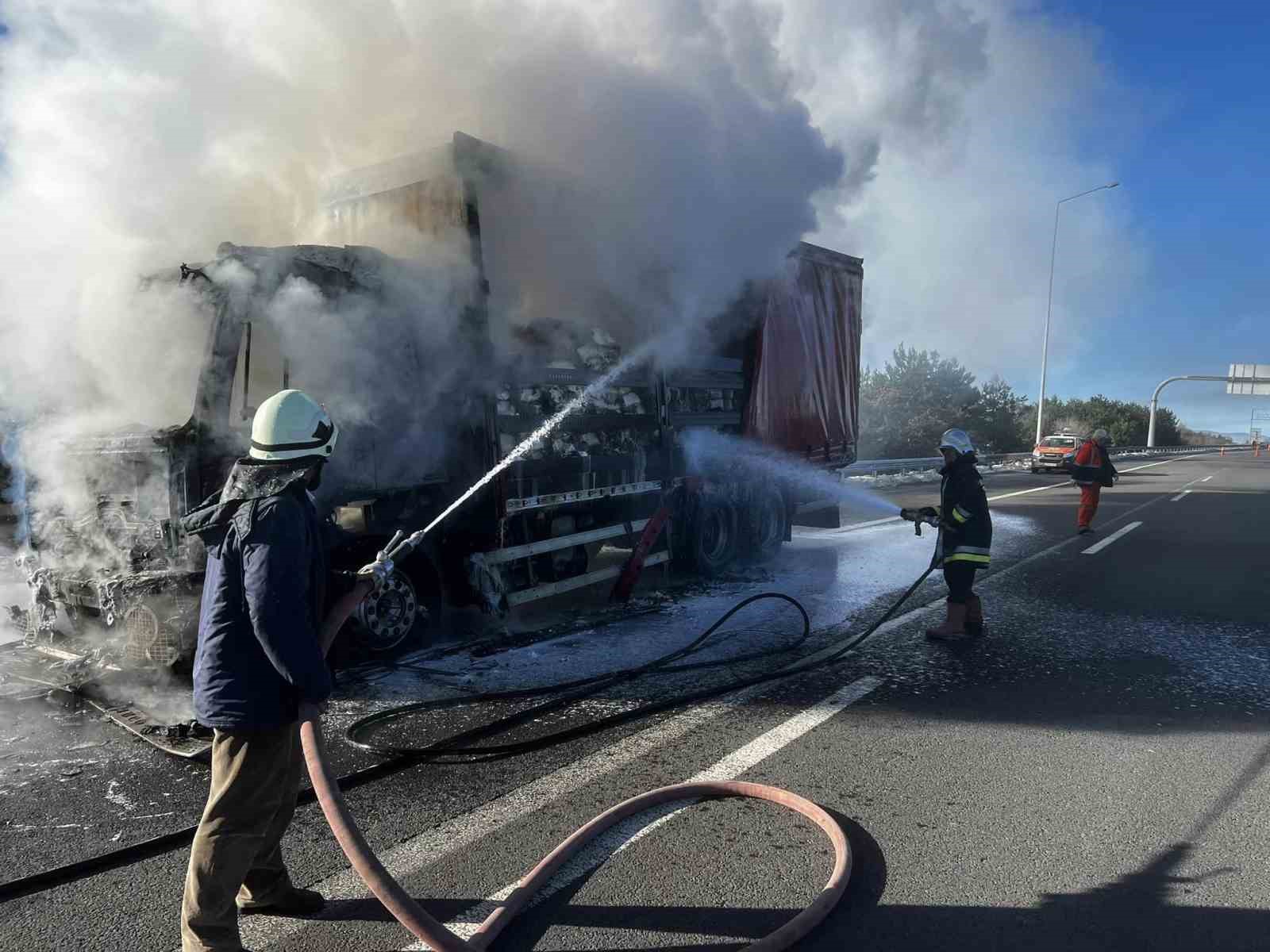 Anadolu Otoyolu’nun Bolu geçişinde çikolata hammaddesi taşıyan bir kamyon, balatalarının tutuşması neticesinde alev alev yandı.