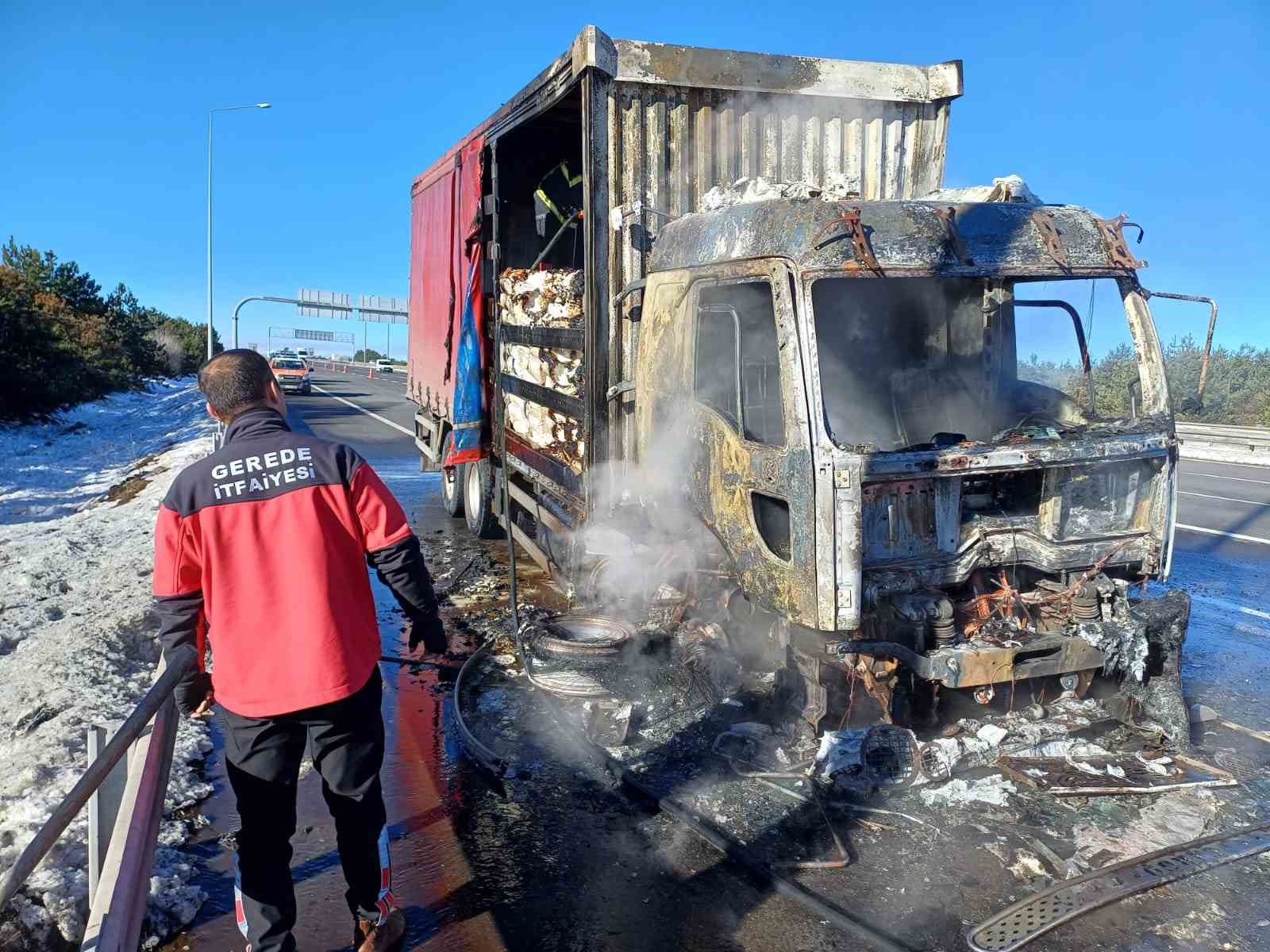 Yangın, Anadolu Otoyolu’nun Bolu geçişinde Gerede ilçesinde meydana geldi. Edinilen bilgiye göre, Ankara istikametinde seyreden sürücüsünün ismi öğrenilemeyen 06 CEY 661 plakalı çikolata hammaddesi taşıyan kamyonun balatalarından duman yükselmeye başladı. Kamyon sürücüsü aracını emniyet şeridine park ederek durumu 112 Acil Çağrı Merkezi’ne bildirdi. Balatalardan çıkan dumanlar kamyonun ön kısmını sardı. Alevlerin giderek büyüdüğü yangın, kamyon kasasında bulunan çikolata hammaddesine sıçradı. Bölgeye sevk edilen Dörtdivan Belediyesi İtfaiye Amirliği ekipleri tarafından alev alev yanan kamyonu söndürmek için müdahale edildi.