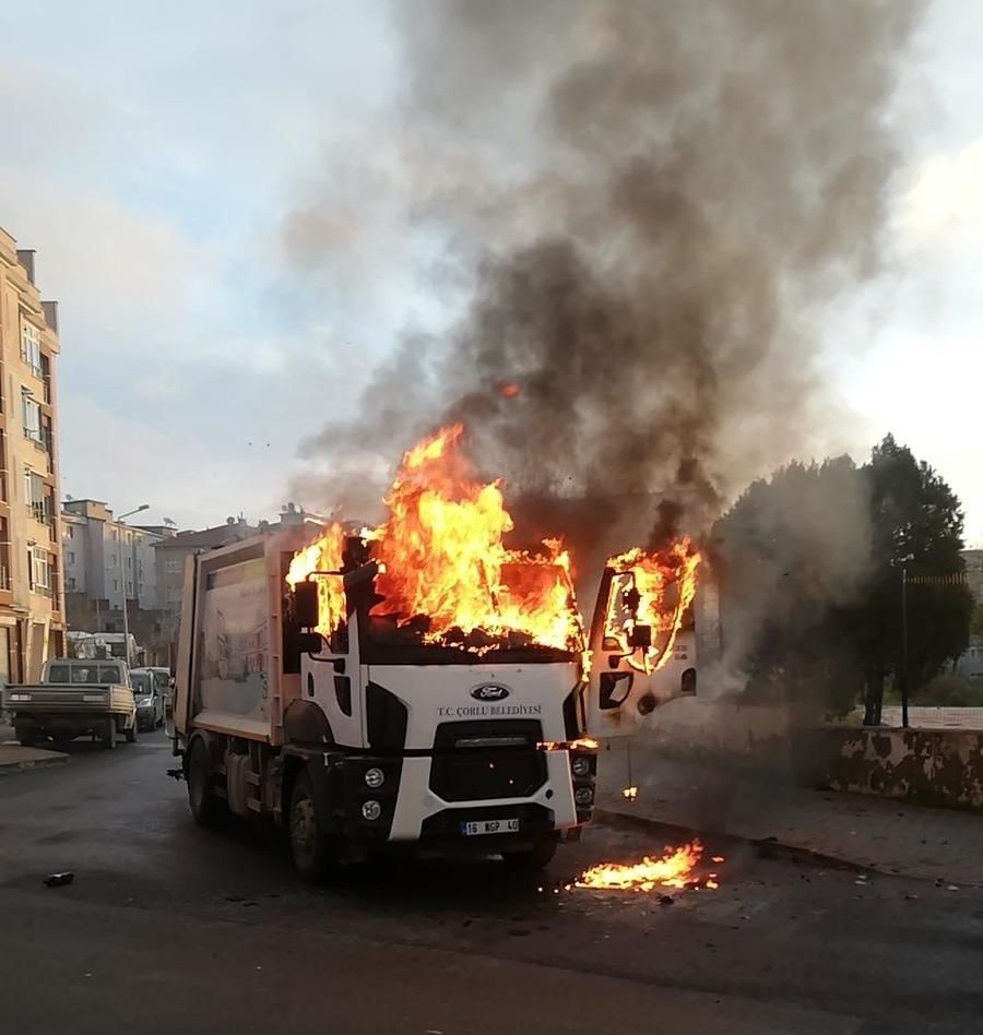Tekirdağ Çorlu’da belediyeye ait çöp kamyonu seyir halindeyken alev alev yandı.