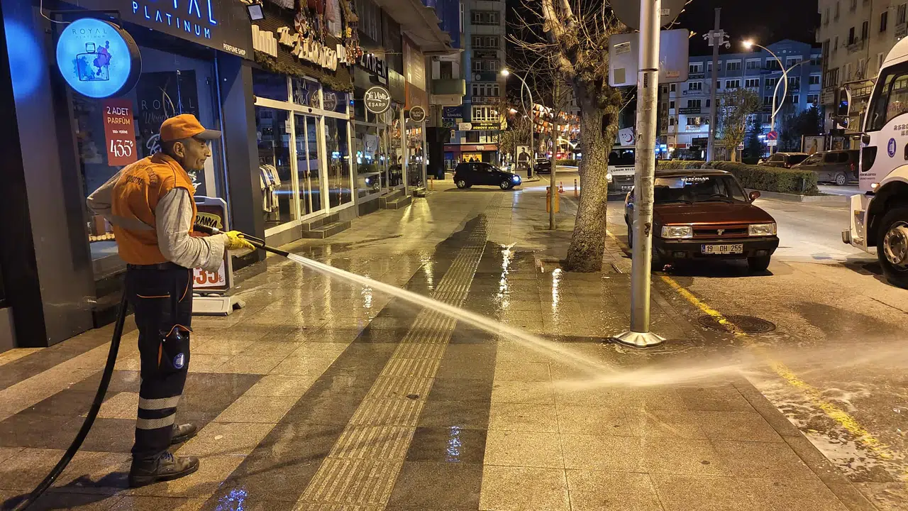 Bayrama hazırlanan Çorum’da mezarlık temizliğinin ardından şehrin caddelerinde de temizlik çalışmaları başladı.