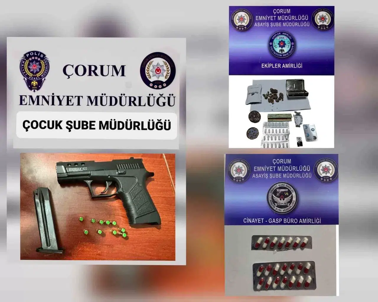 Çorum İl Emniyet Müdürlüğü’nün asayiş ve güvenliğin sağlanmasına yönelik çalışmaları devam ediyor. Asayiş Şube Müdürlüğü ekipleri tarafından 01 Mart-08 Mart tarihleri arasında yapılan şok uygulamalar ile şüphe ve ihbar üzerine yapılan çalışmalar neticesinde çok sayıda silah ve uyuşturucu madde ele geçirildi.