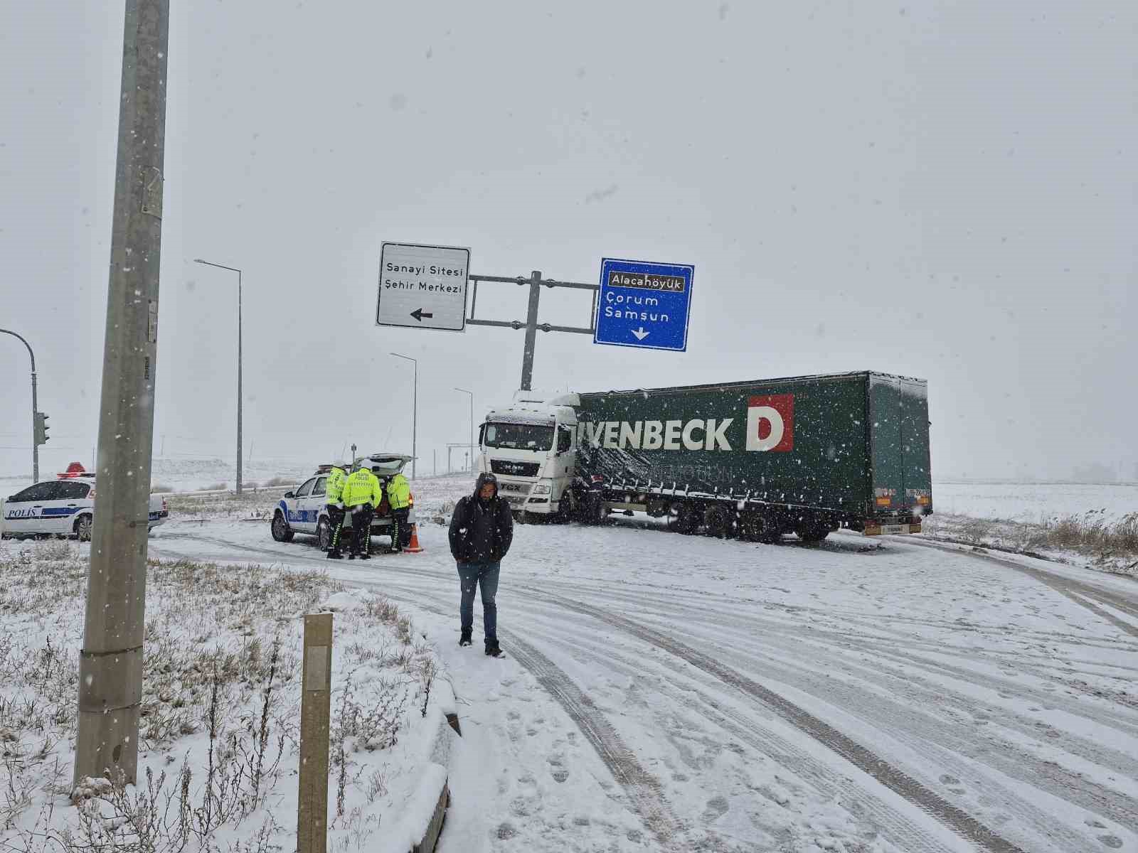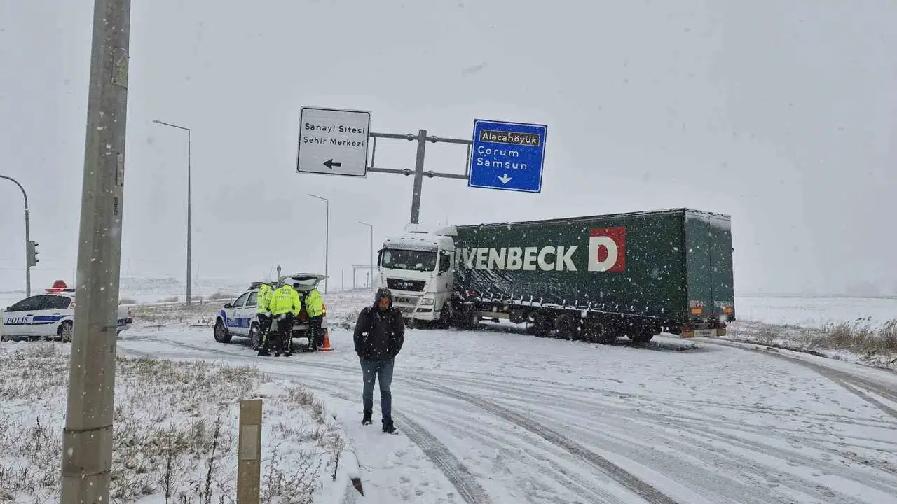 Meteorolojinin yağış uyarısında bulunduğu Çorum’da sabah saatlerinden itibaren kar yağışı etkili olmaya başladı. Özellikle yüksek rakımlı alanlar, lapa lapa yağan kar ile beyaza büründü. Kar yağışının Alaca ilçesinde etkili olan kar yağışı kazaya sebep oldu. Çorum-Akacak karayoluna seyir halinde olan bir tır, karlı yolda kayması neticesinde makaslayarak tabela direğine çarptı. Kazada can kaybı ya da yaralanan olmadı. Kar yağışı sebebiyle yolun Çorum istikameti trafiğe kapandı. Yolda tır kuyruğu oluştu.