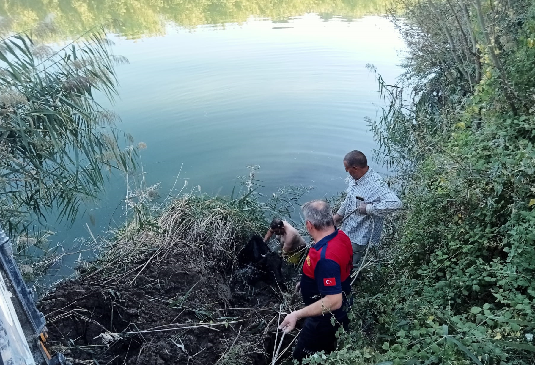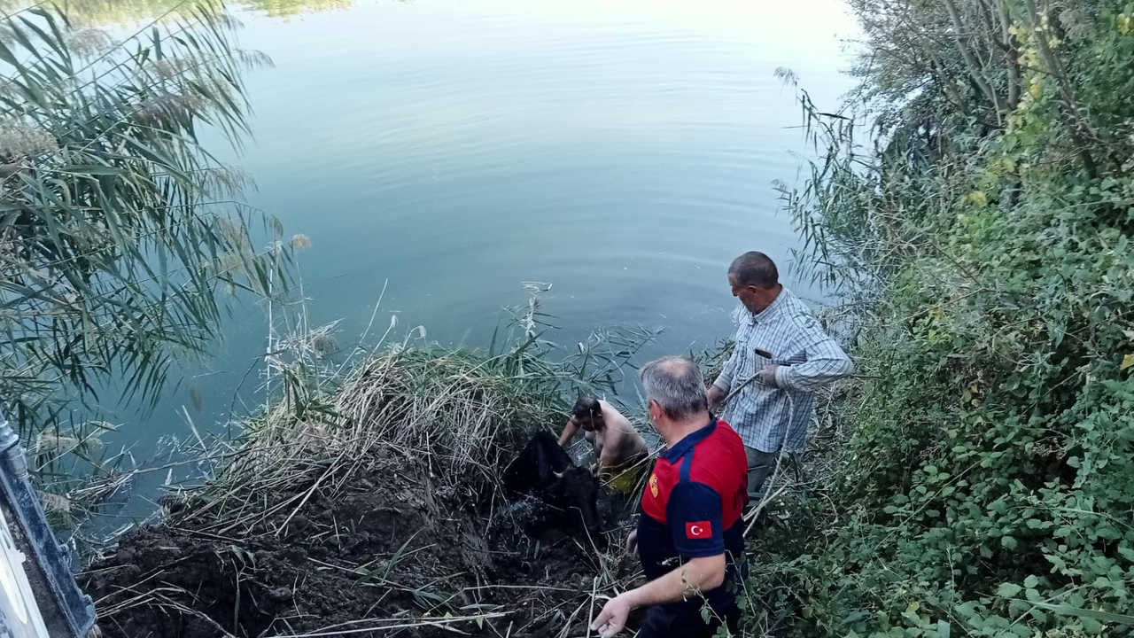 İtfaiye personeli iş makinesine bağlı ipe ineği bağlayarak kıyıya çıkardı. İnek sahibine teslim edildi.