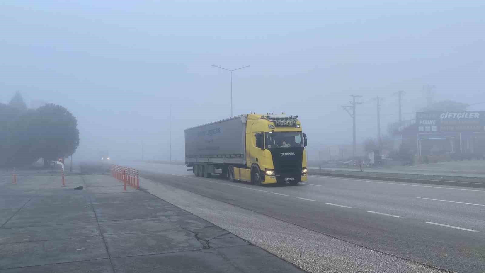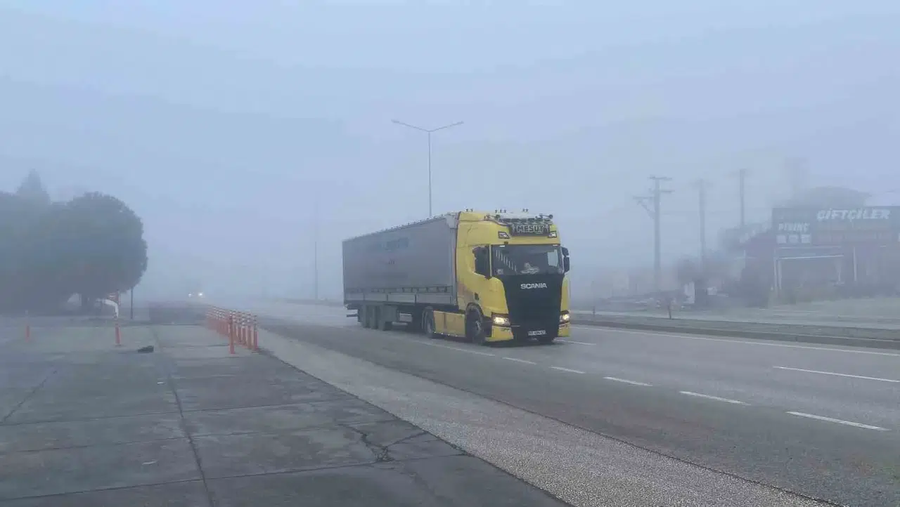 Çorum’un Osmancık ilçesinde etkili olan yoğun sis kara yolunda görüş mesafesini 50 metreye kadar düşürdü.