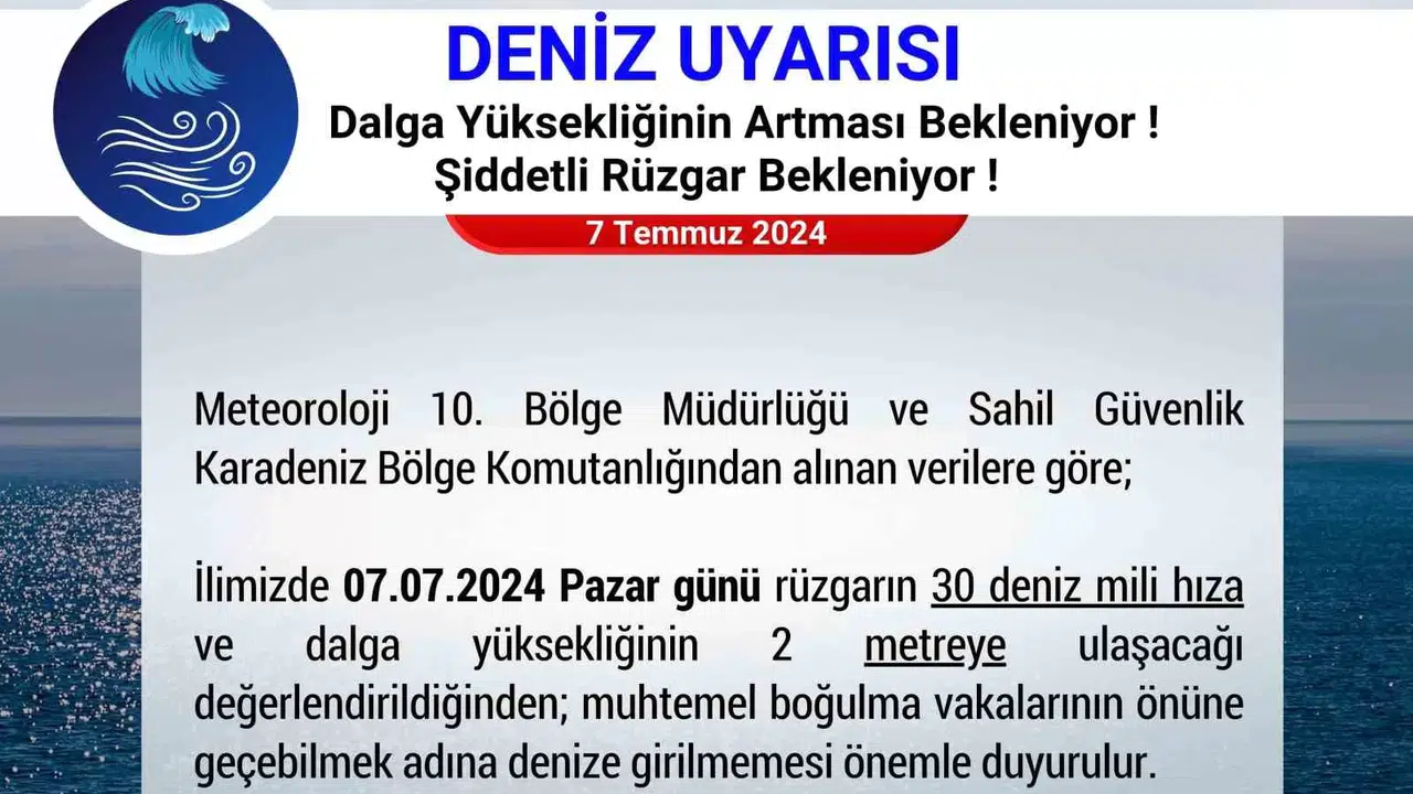 Yapılan uyarıda, "İlimizde Pazar günü rüzgarın 30 deniz mili hıza ve dalga yüksekliğinin 2 metreye ulaşacağı değerlendirildiğinden; muhtemel boğulma vakalarının önüne geçebilmek adına denize girilmemesi önemle duyurulur" ifadeleri kullanıldı.