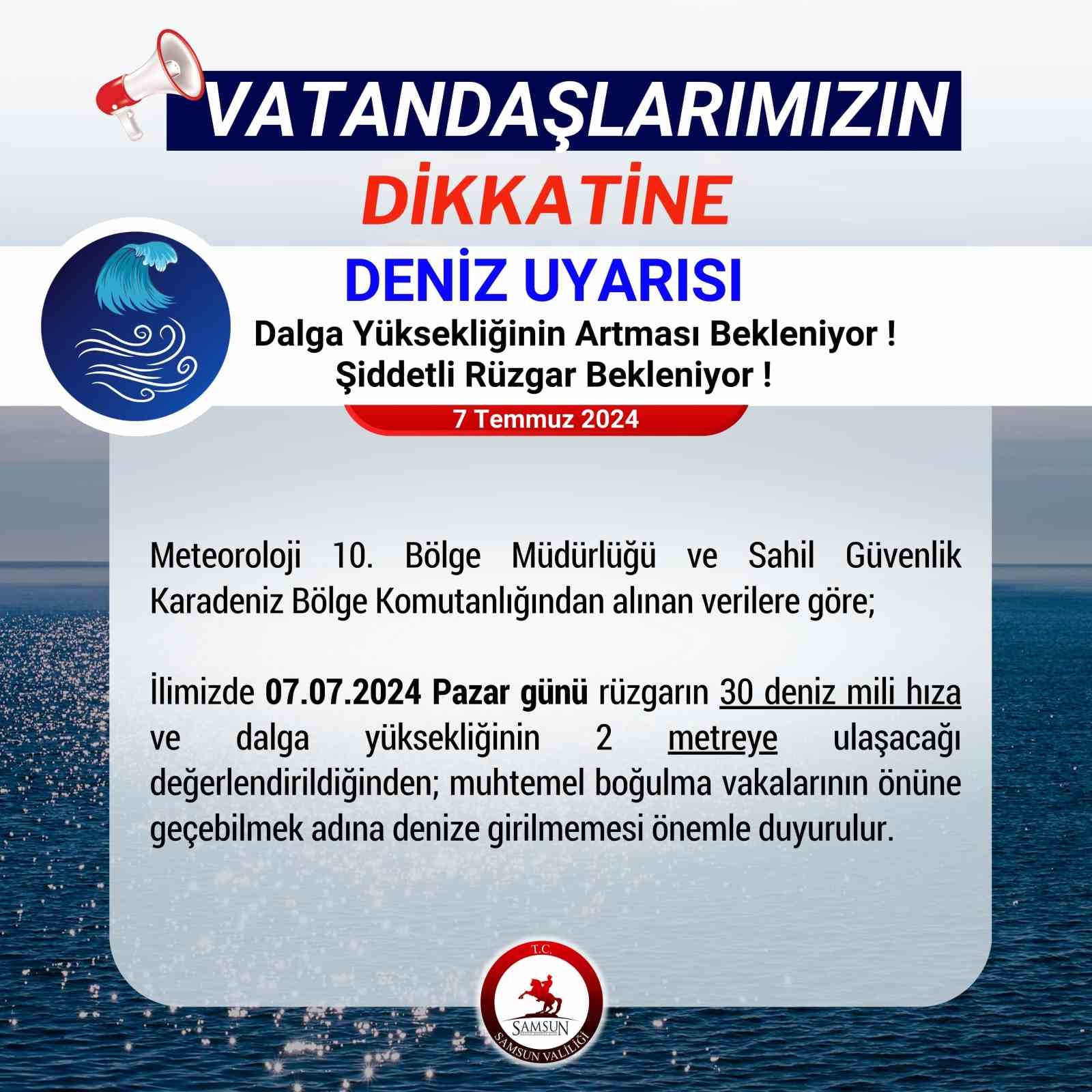 SAMSUN (İHA) – Samsun Valiliği, dalga yüksekliğinin 2 metreyi bulacağının tahmin edilmesinden dolayı ’denize girilmemesi’ gerektiğini duyurdu.