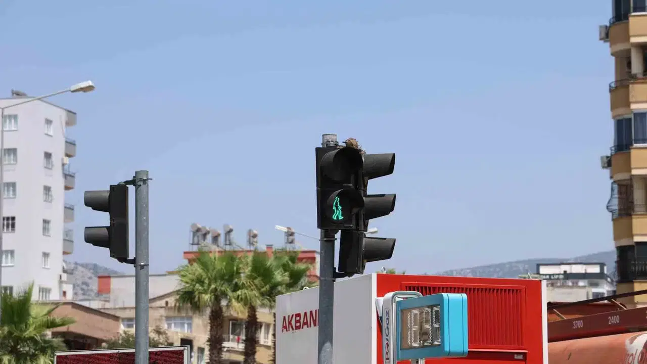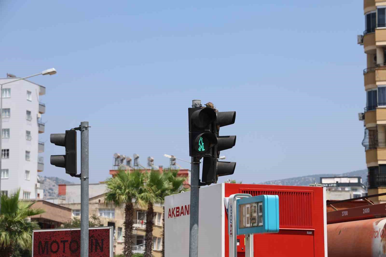 Adana’nın Kozan ilçesinde trafik ışıklarının üzerine yuva yapan kumru, 49 derece sıcağa rağmen yavrusunun yanından ayrılmıyor.