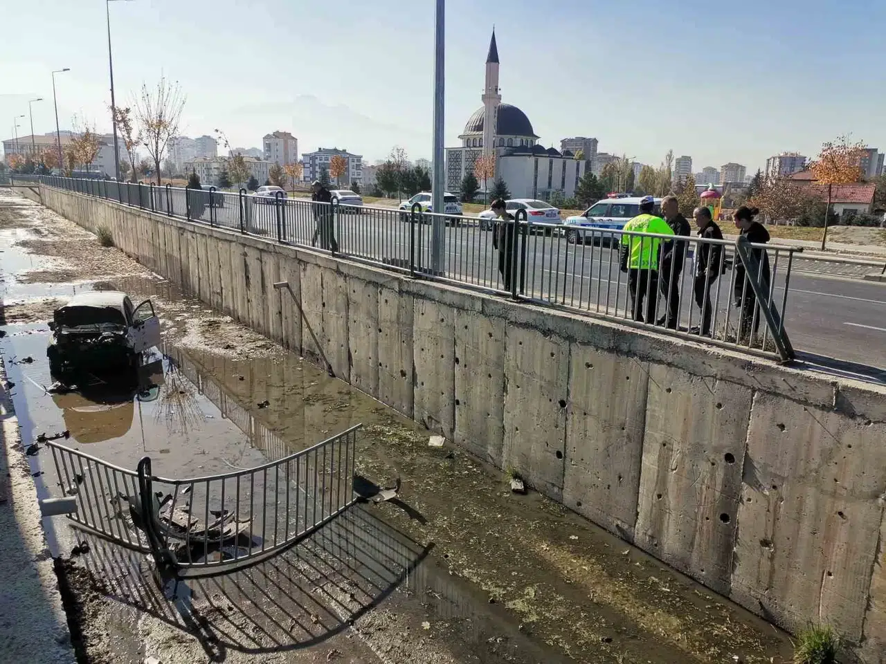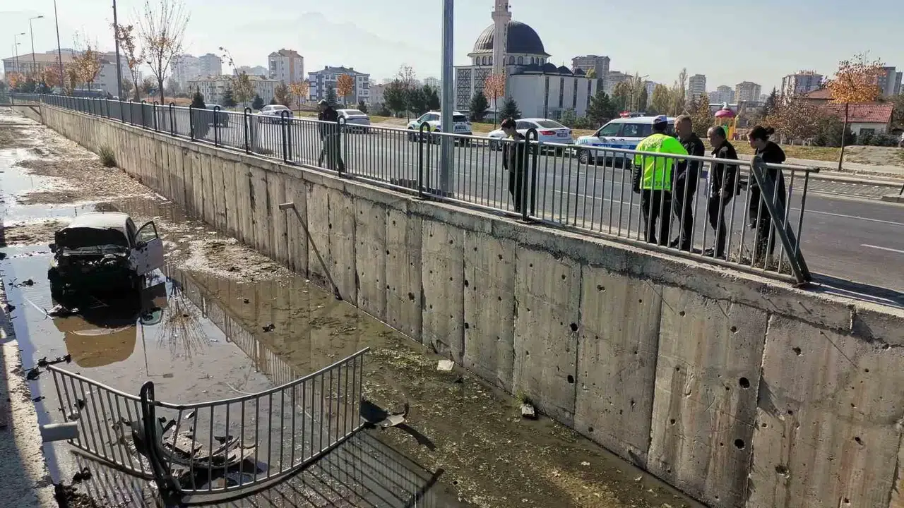 Kayseri’nin Melikgazi ilçesinde sürücüsünün direksiyon hakimiyetini kaybettiği otomobil bariyerleri aşarak kanala uçtu.