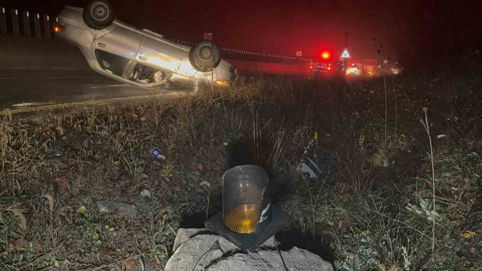 Kontrolden Çıkan Araç Sis İkaz Lambasına Çarpıp Takla Attı: 3 Yaralı