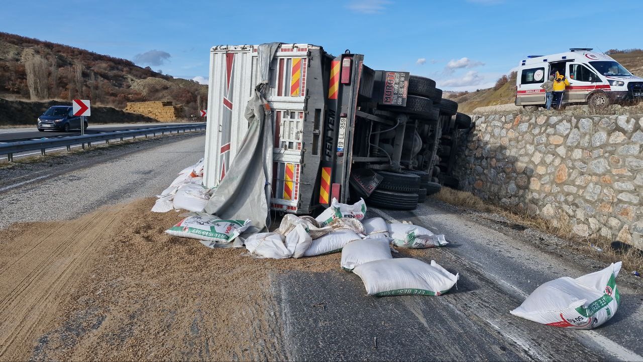 Çorum’da sürücüsünün kontrolünden çıkan tır devrildi. Kazada araç sürücüsü yaralandı.