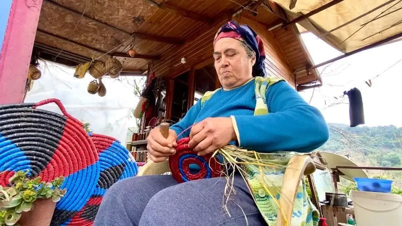 Hatay’ın Samandağ ilçesinde yaşayan afetzede Neriman Şahan, renklendirdiği buğday saplarını örerek yaptığı tepsilerle aile ekonomisine katkı sağlıyor.