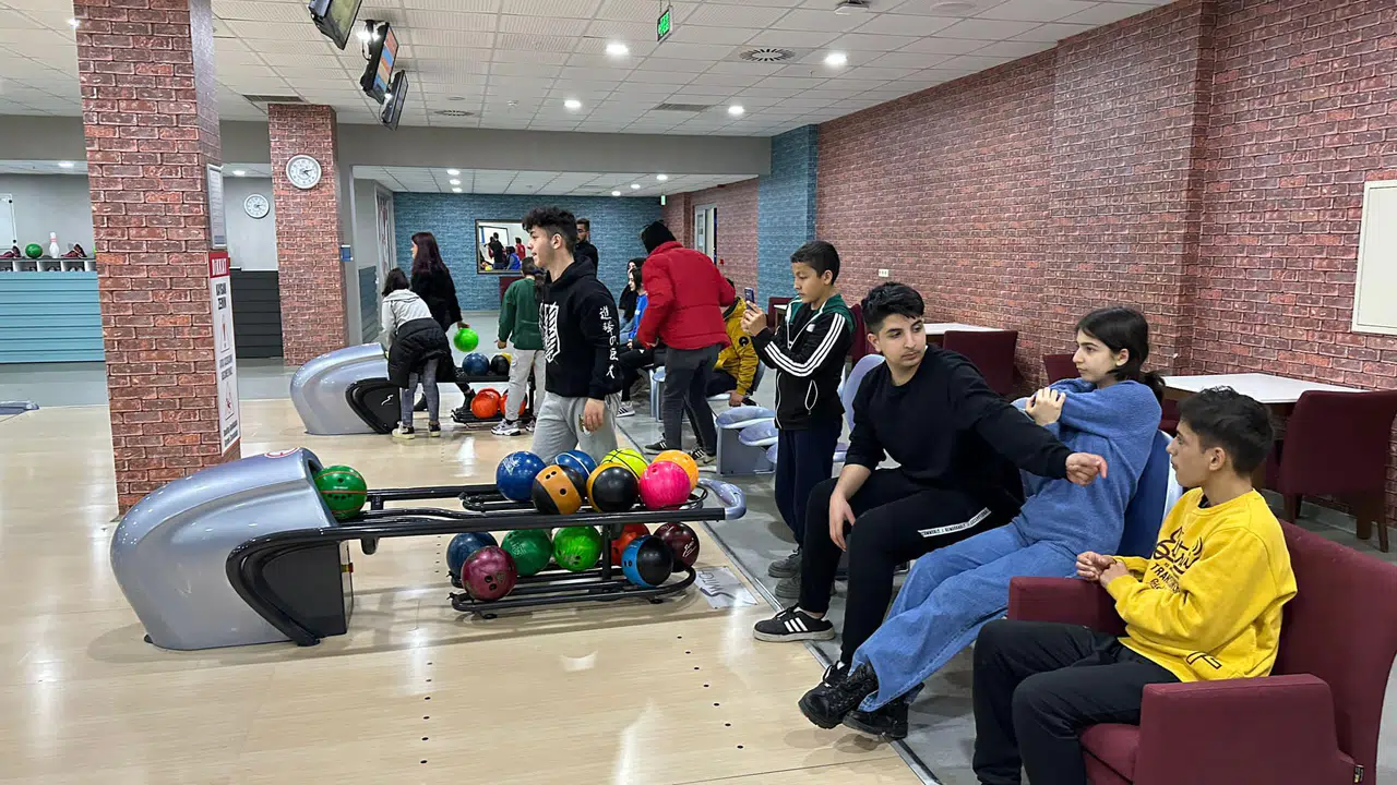 Yaklaşık 15 kişilik depremzede çocuk, bowling turnuvasında birbirleri ile yarışırken yüzleri güldü.