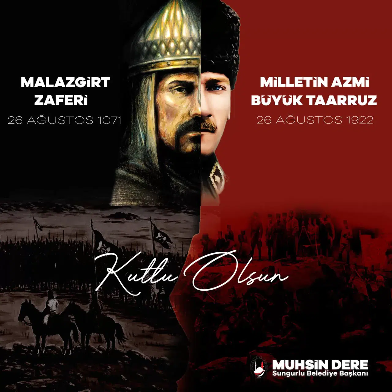 Sungurlu Belediye Başkanı Dere, sosyal medya hesaplarından yaptığı paylaşımda Malazgirt Zaferini ve Büyük Taarruzu kutlayarak Fatih’i, Sultan Alparslan'ı ve Gazi Mustafa Kemal Atatürk’ü andı.