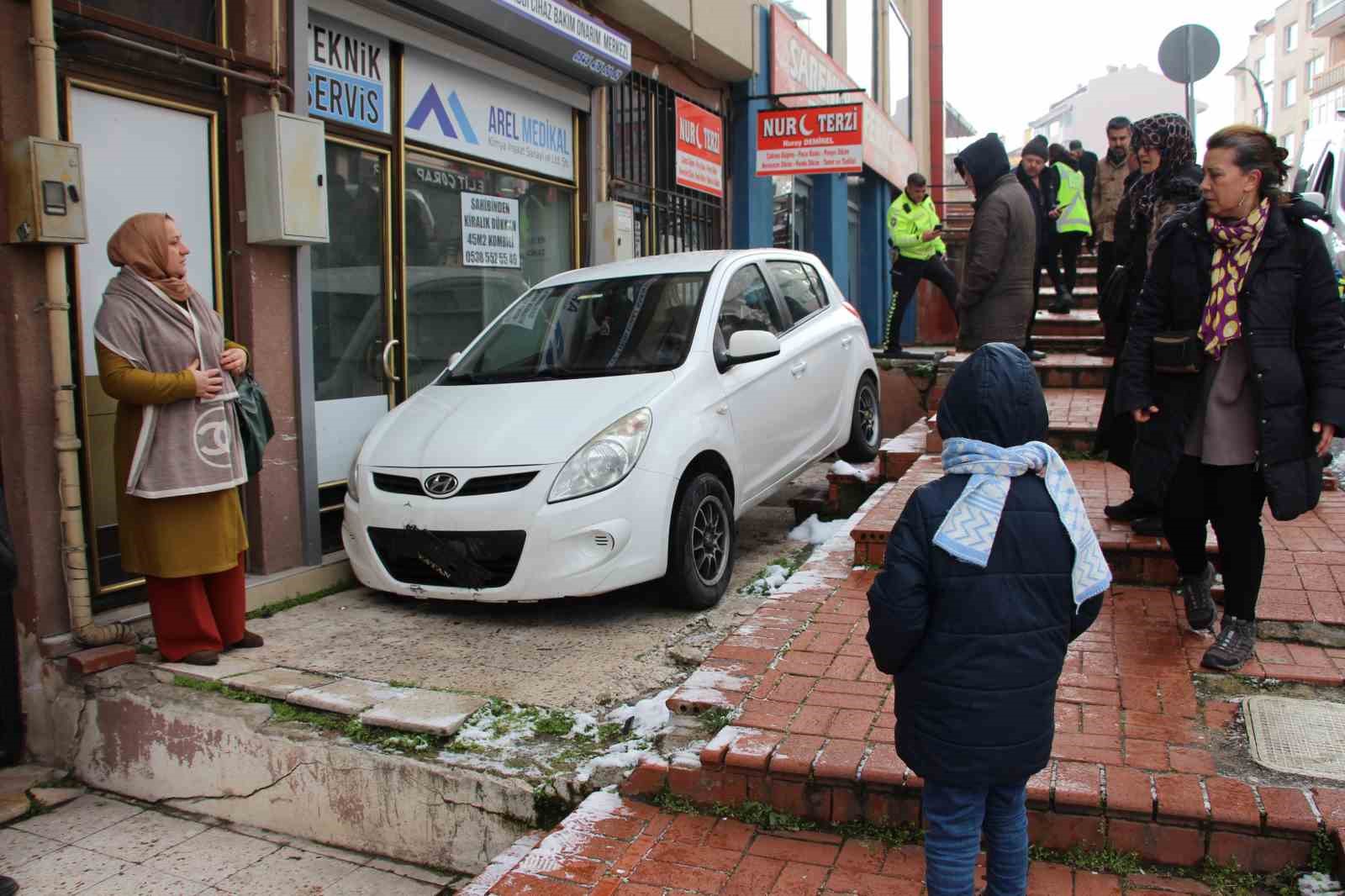 Olay, Karamanlı Mahallesi’nde Stadyum Caddesi’nde meydana geldi. Edinilen bilgiye göre, dik yokuşun bulunduğu Stadyum Caddesi’nde seyreden, içerisinde F.T. idaresindeki 34 GJ 9406 plakalı otomobil, kontrolden çıktı. Sürücüsünün direksiyon hakimiyetini kaybettiği otomobil, dükkanların önündeki merdivenlere uçtu. Dükkanların önünde askıda kalan otomobil, çevrede paniğe sebep oldu. Otomobilde bulunan 4 kişi ise olaydan yara almadan kurtuldu. Bölgede devriye halinde olan polis ekipleri kazaya denk geldi. Polis ekipleri tarafından vinç çağırılarak otomobil düştüğü boşluktan kurtarıldı.