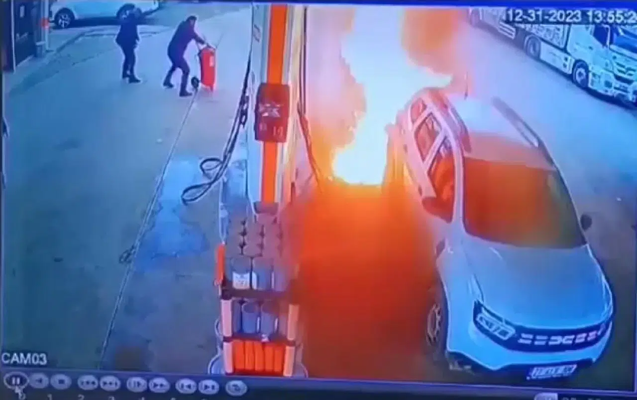 Diyarbakır’ın Bismil ilçesinde akaryakıt istasyonunda bir otomobil yakıt aldığı esnada deposunun alev aldığı anlar güvenlik kamerasına yansıdı.
