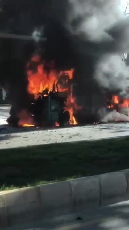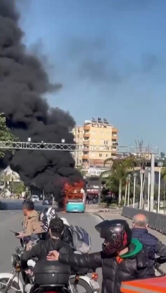 Edinilen bilgiye göre, olay, öğle saatlerinde Mersin’in merkez Akdeniz ilçesi GMK Bulvarı üzerinde meydana geldi. Çarşı istikametine seyir halinde olan Pozcu Koop’a ait bir minibüs, ön taraftan yanmaya başladı. Şoför aracı hemen sağa çekerken, yolcular ve kendisi araçtan indi. Kısa sürede alev tüm minibüsü sararken, ihbar üzerine bölgeye itfaiye ekipleri sevk edildi. Dumanlar şehrin birçok noktasından görünürken, minibüste ara ara patlamalar oldu. İtfaiye ekiplerinin müdahale ettiği yangında zarar gören olmazken, minibüsten geriye demir yığını kaldı.
