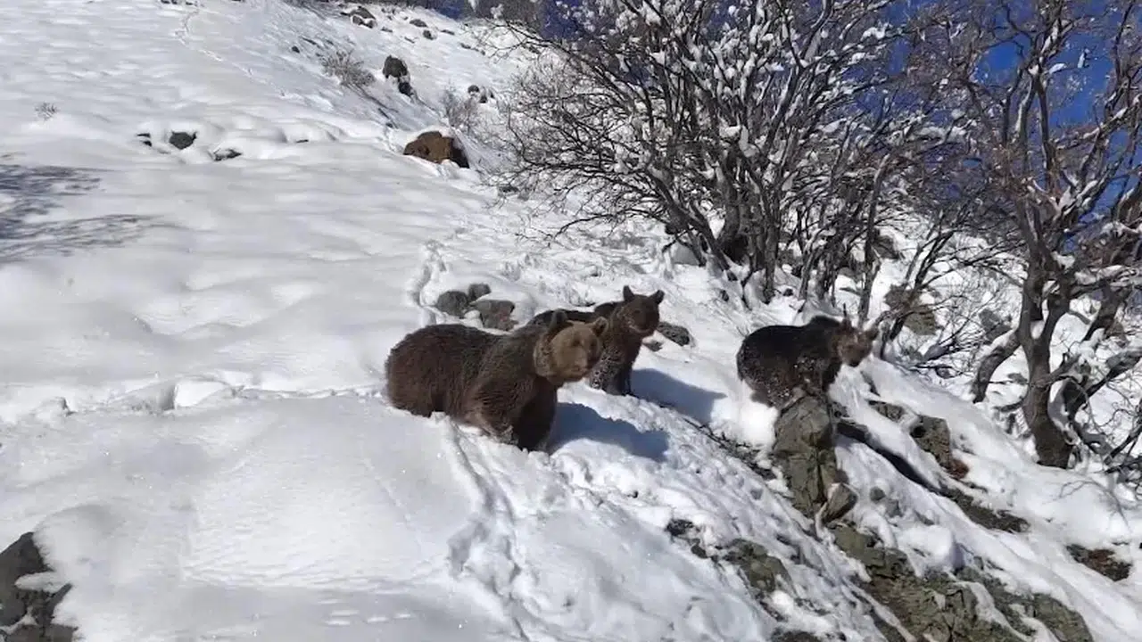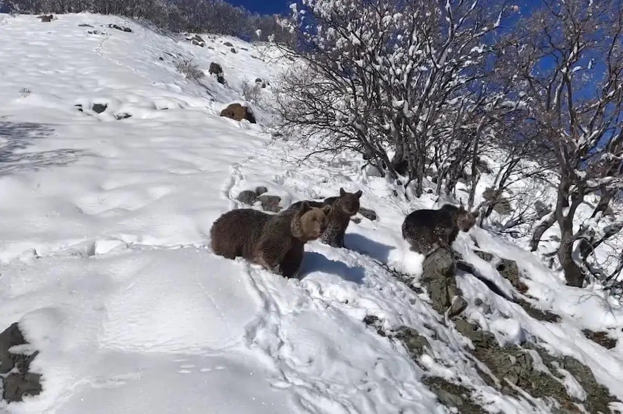 Tunceli’de doğa fotoğrafçılığı yapan Murat Can Toprakçı ile Düzgün Bozay, Pülümür ilçesinde karlı zirvelerde yiyecek arayan bir anne ve 2 yavru boz ayıyı dron kamerasıyla kayıt altına aldı. Kar kalınlığının arttığı bölgelerde güçlükle ilerleyen ayı ailesi görüntülenmelerine aldırış etmezken, ormanlık alana doğru giderek gözden kayboldu.