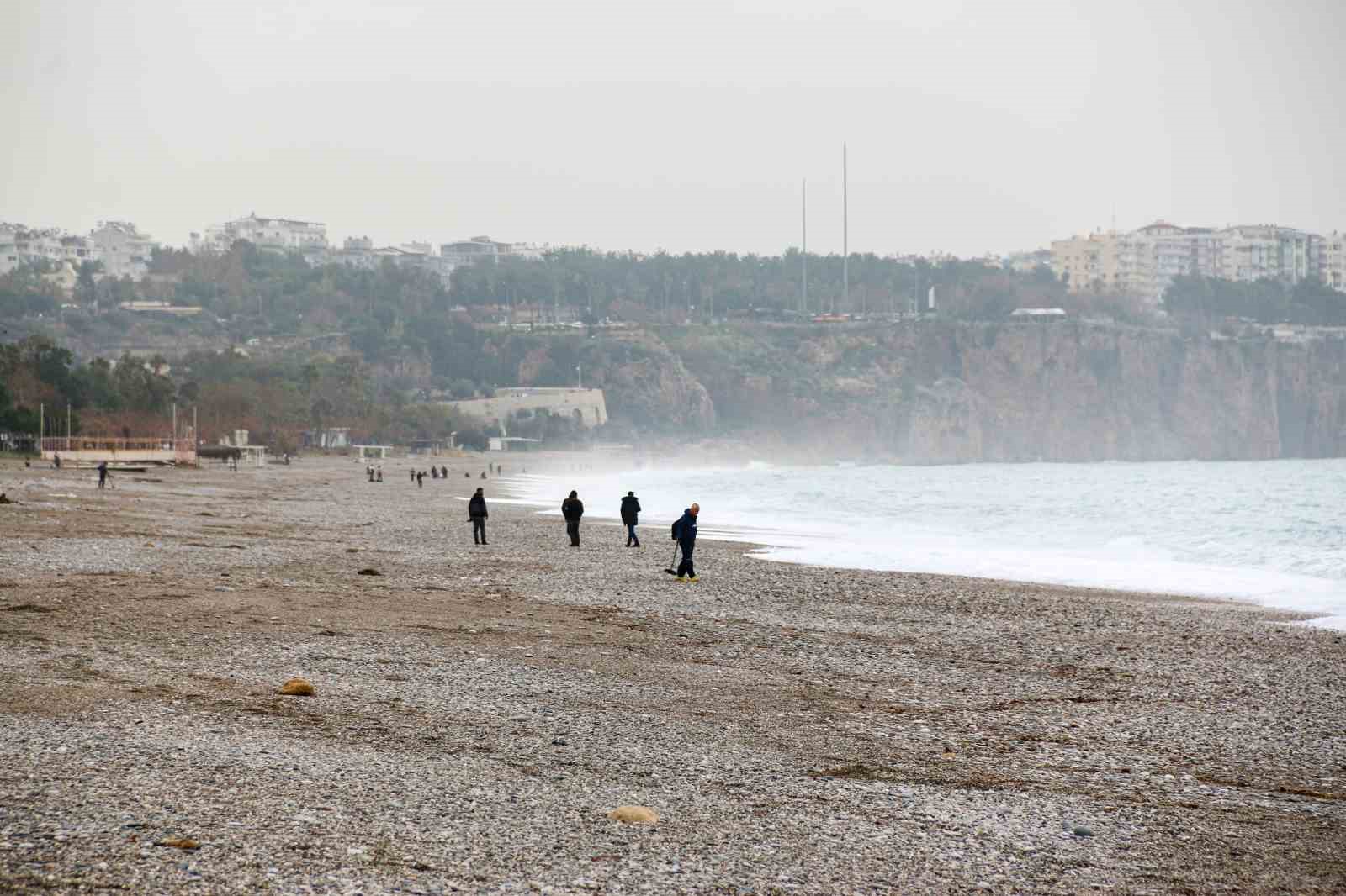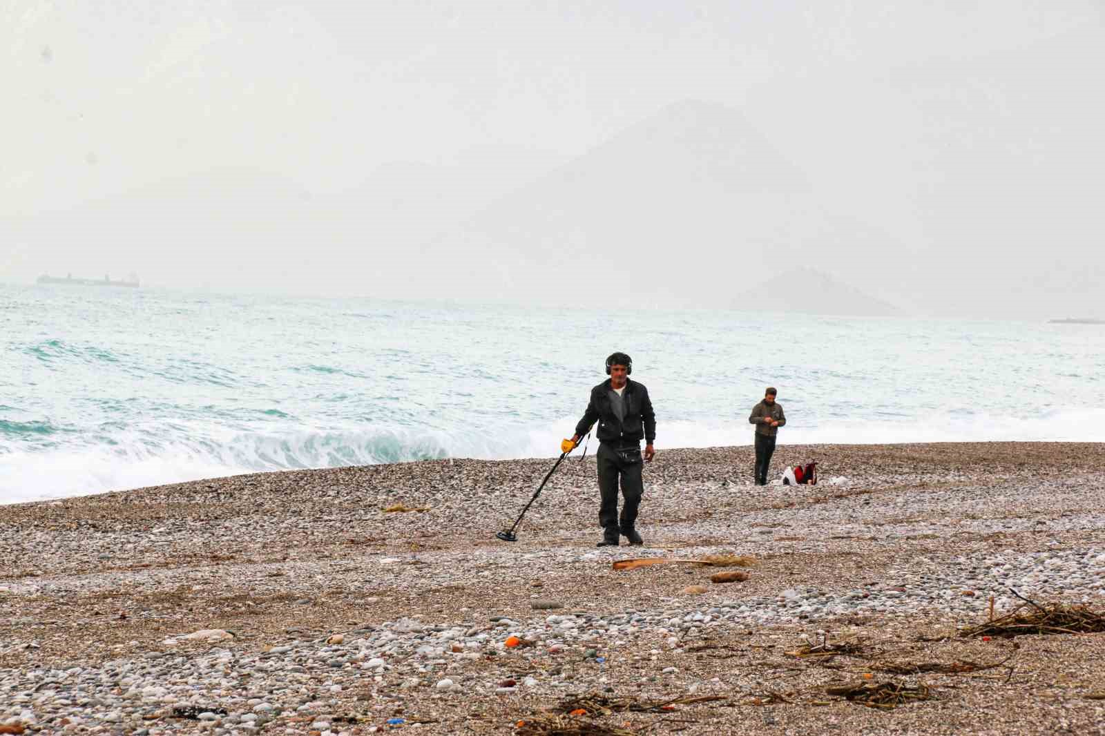 Antalya’nın dünyaca ünlü Konyaaltı sahili şiddetli yağış ve fırtınanın ardından dedektörle altın ve bozuk para arayanların adresi oldu. Birçok vatandaş ise dalgaları izlerken, yabancı uyruklu kişiler ise denize girmeye çalıştı.
