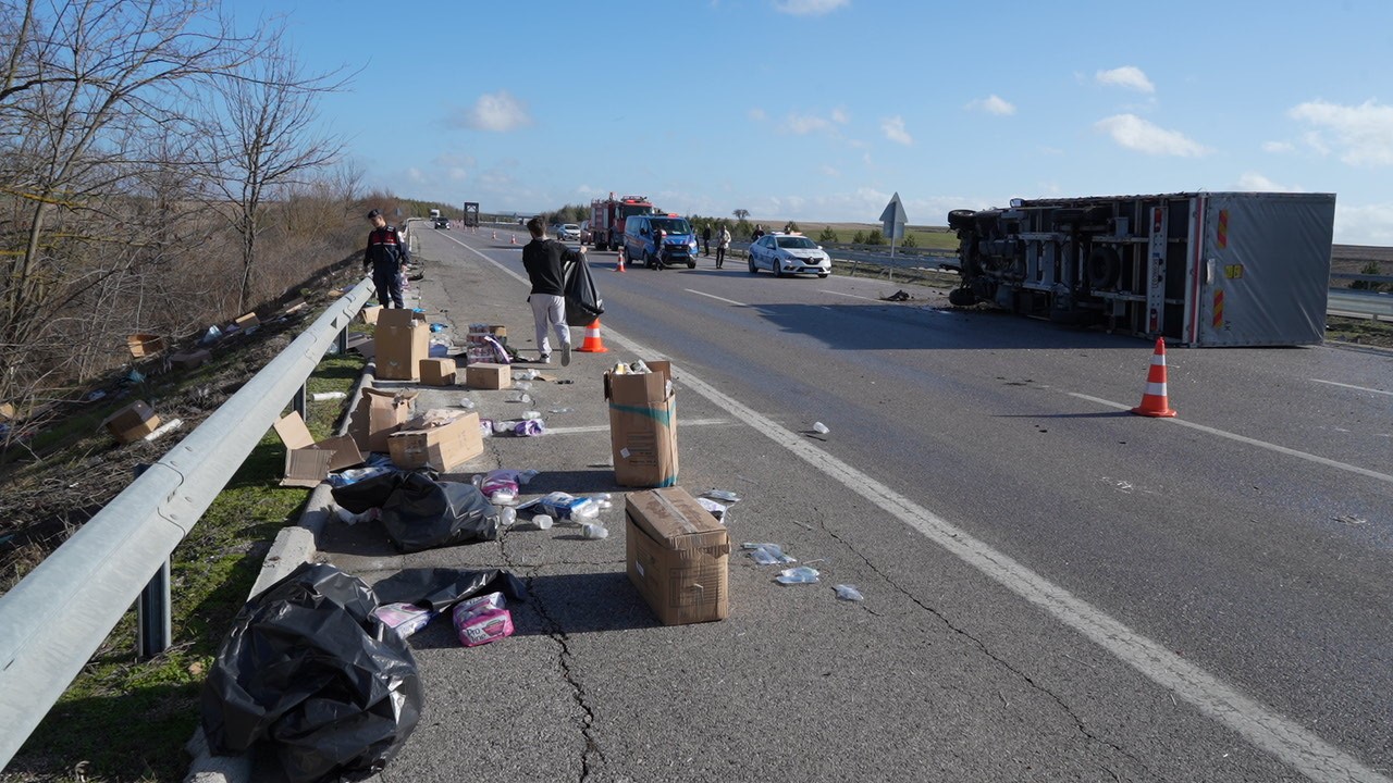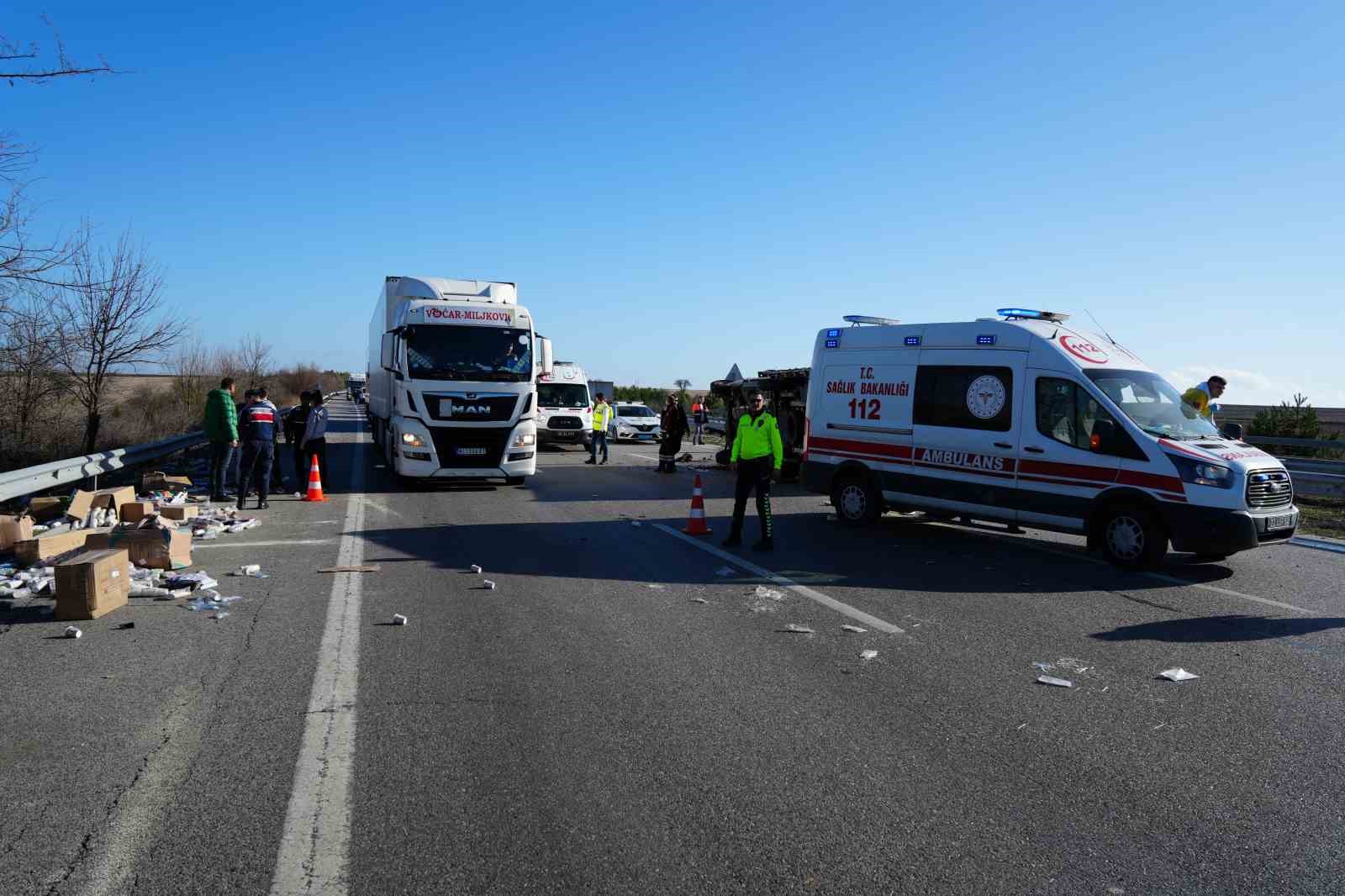 Edirne-İstanbul TEM Otoyolu’nda iki kamyonetin çarpışması sonucu devrilen iki kamyonetten birinin yola savrulan plastik ve hayvan mamaları sebebiyle otoyol kısmen trafiğe kapatıldı.
