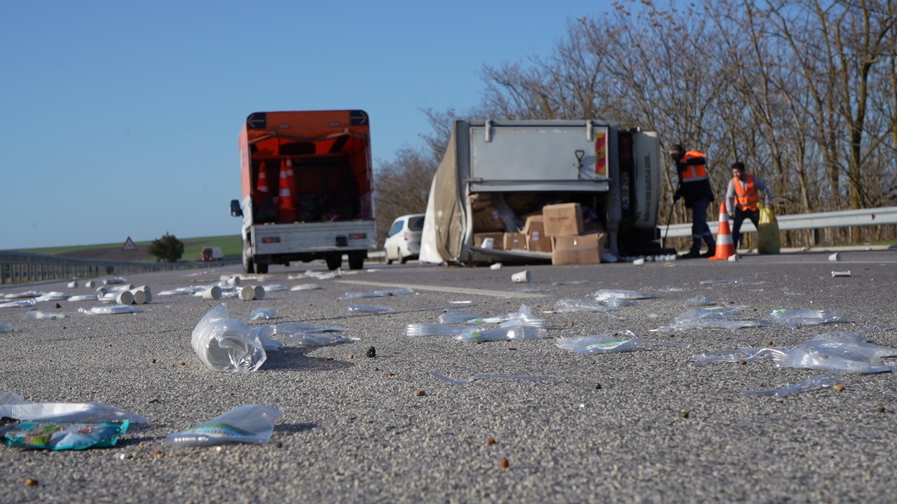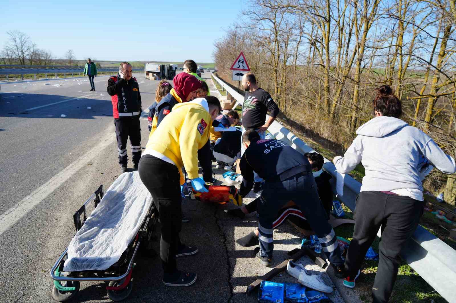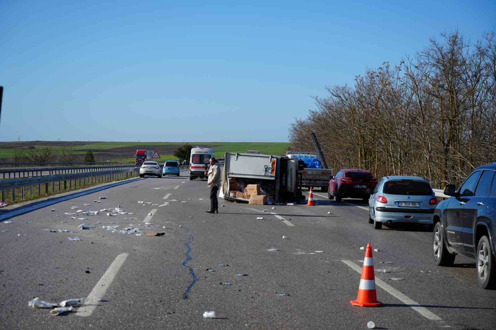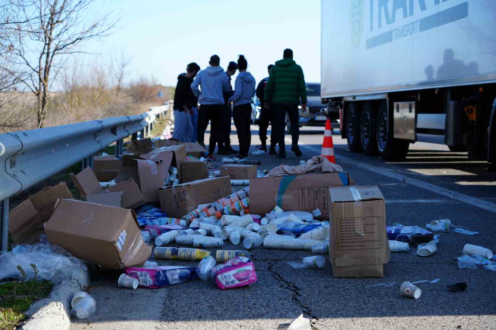 Kazada kamyonetteki kedi ve köpek mamalarıyla plastiklerin yola savrulması nedeniyle TEM Otoyolu’nun Edirne yönüne giden tarafı trafiğe bir süre kapandı.