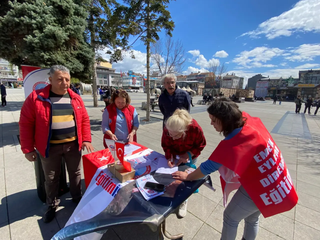 Eğitim-İş Çorum Şubesi güvenli okul ve sağlıklı eğitim talebiyle Kadeş Barış Meydanı'nda stant açarak ülke genelinde eş zamanlı yürütülen imza kampanyası kapsamında vatandaşlardan destek topladı ve bilgilendirici broşürler dağıttı.