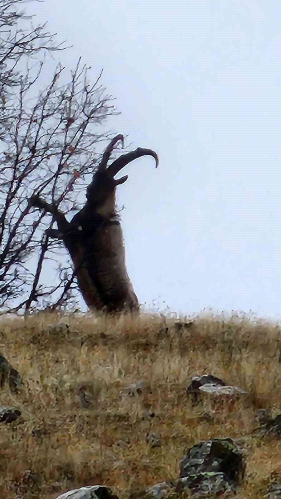 Elazığ’da koruma altında bulunan dağ keçileri yiyecek ararken görüntülendi.