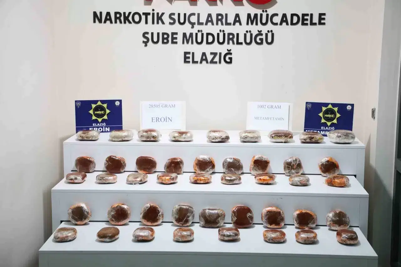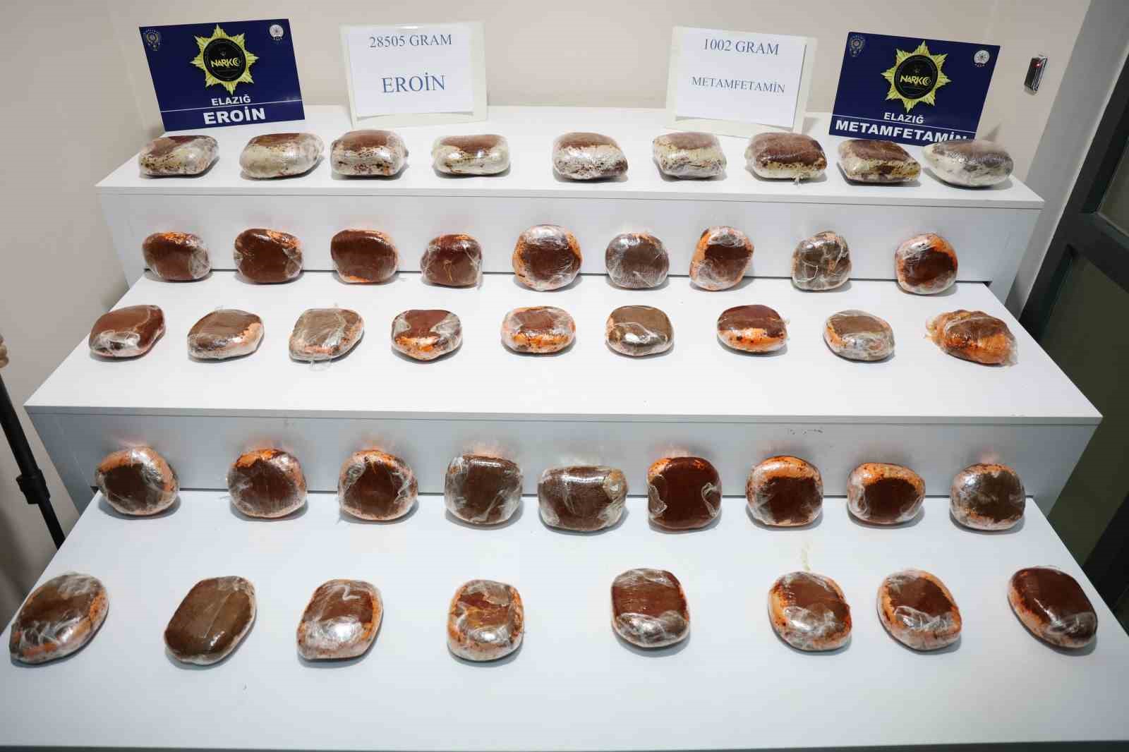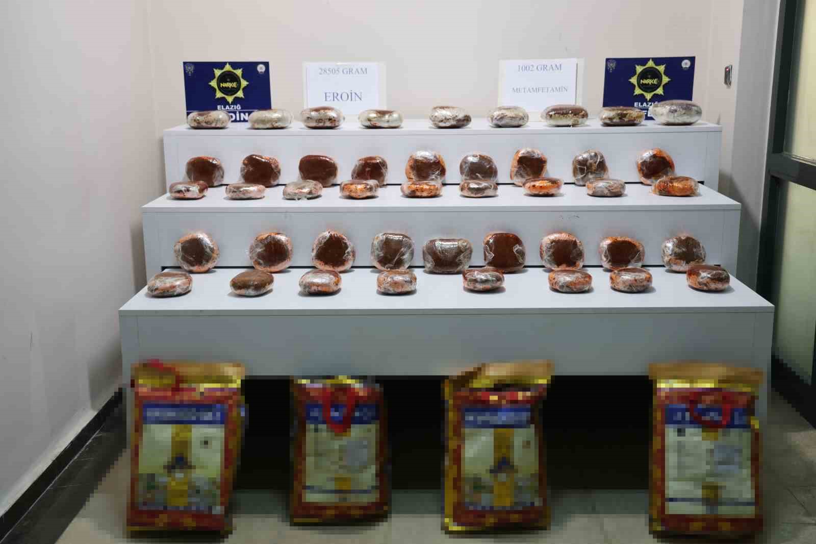 Elazığ’da polis ekipleri tarafından yapılan çalışmada, pirinç paketlerinin içerisine salça ile streçlenmiş vaziyette 28 kilo 505 gram eroin ve 1 kilo 2 gram metamfetamin ele geçirildi.