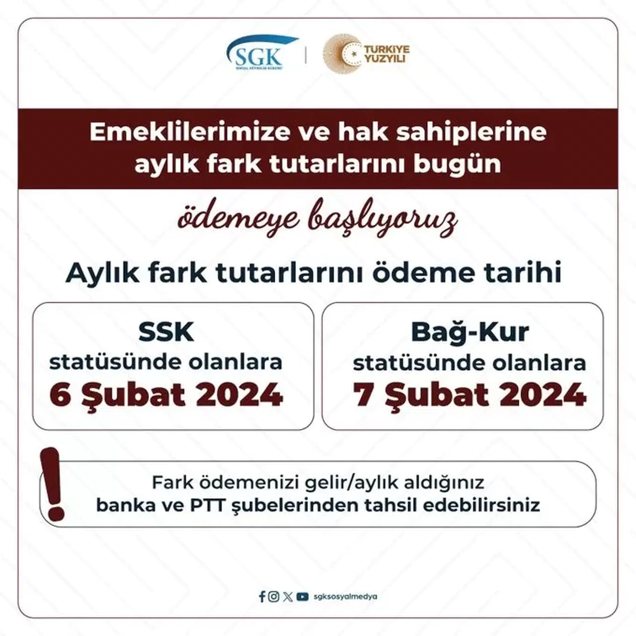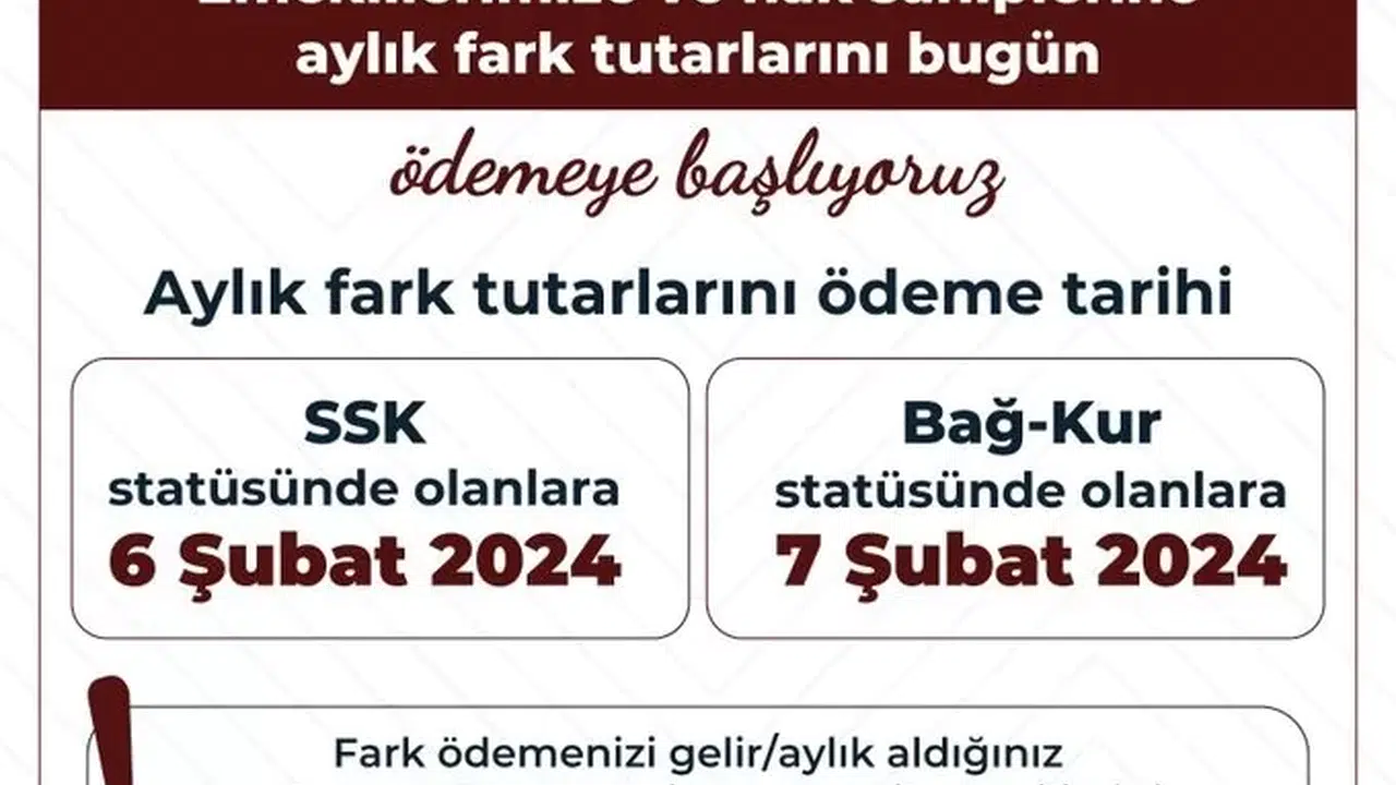 Bu çerçevede SSK ve BAĞ-KUR emeklilerine yapılan zamların farkları bugün ödenmeye başlıyor. SSK emeklilerine yapılan zammın farkı bugün 6 Şubat, Bağ-Kur emeklilerine yapılan zammın farkı ise 7 Şubat hesaplara yatacak.