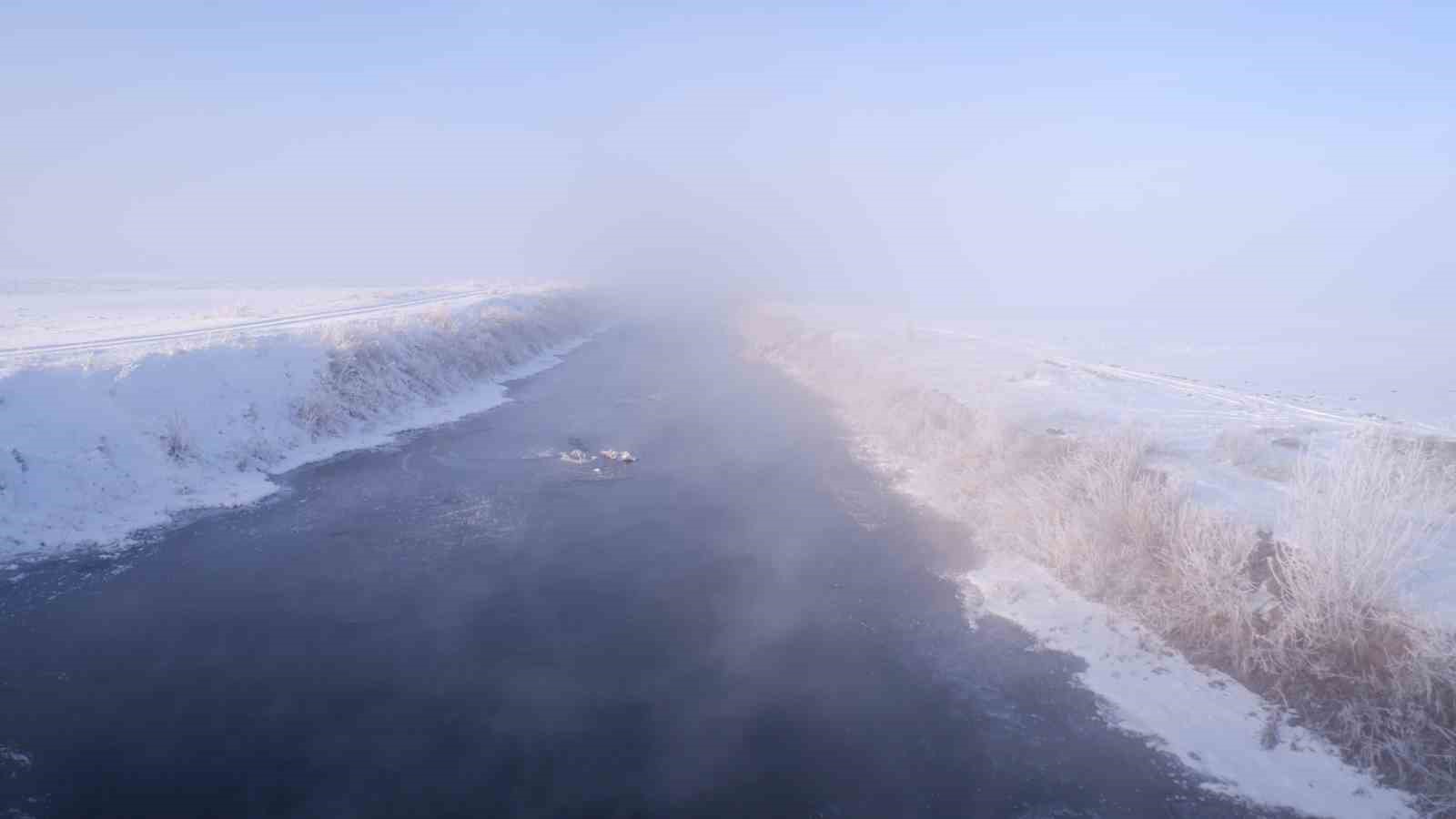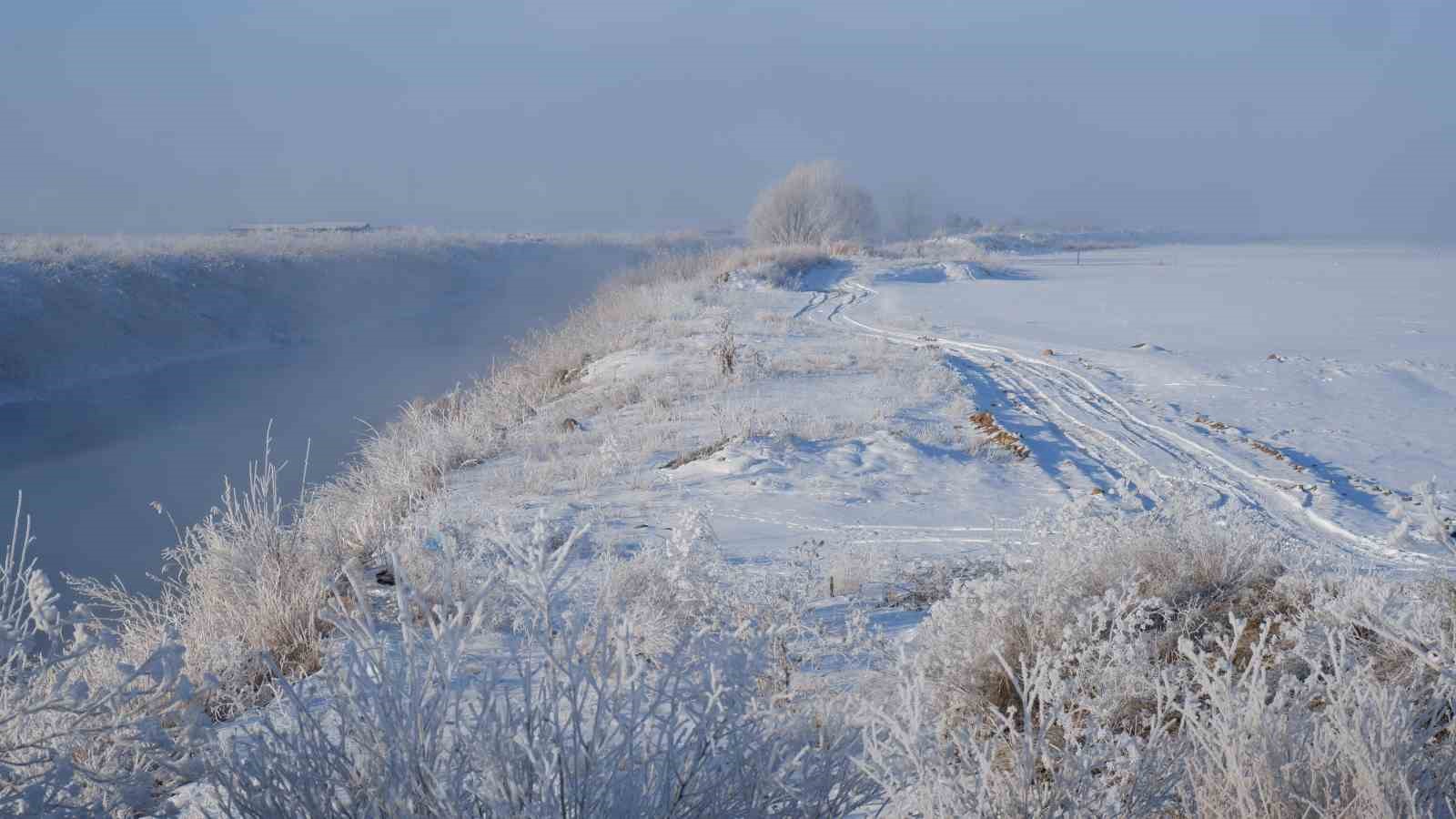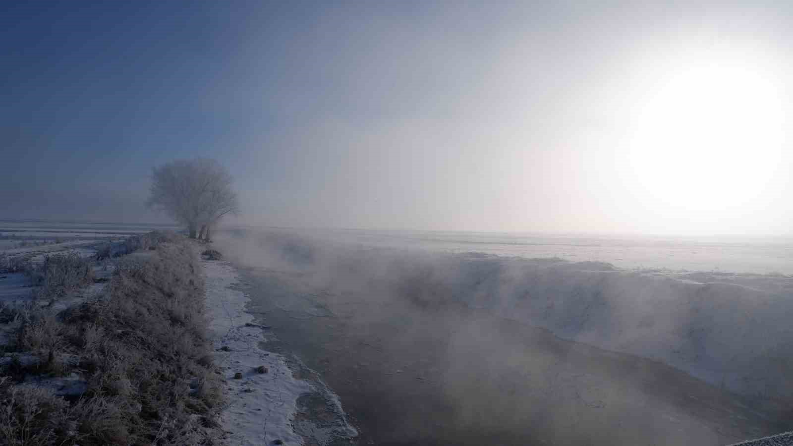 Termometrelerin-20’nin altına düştüğü Erzurum’da ağaçlar kırağından beyaza büründü, Karasu’nun yüzeyi dondu.