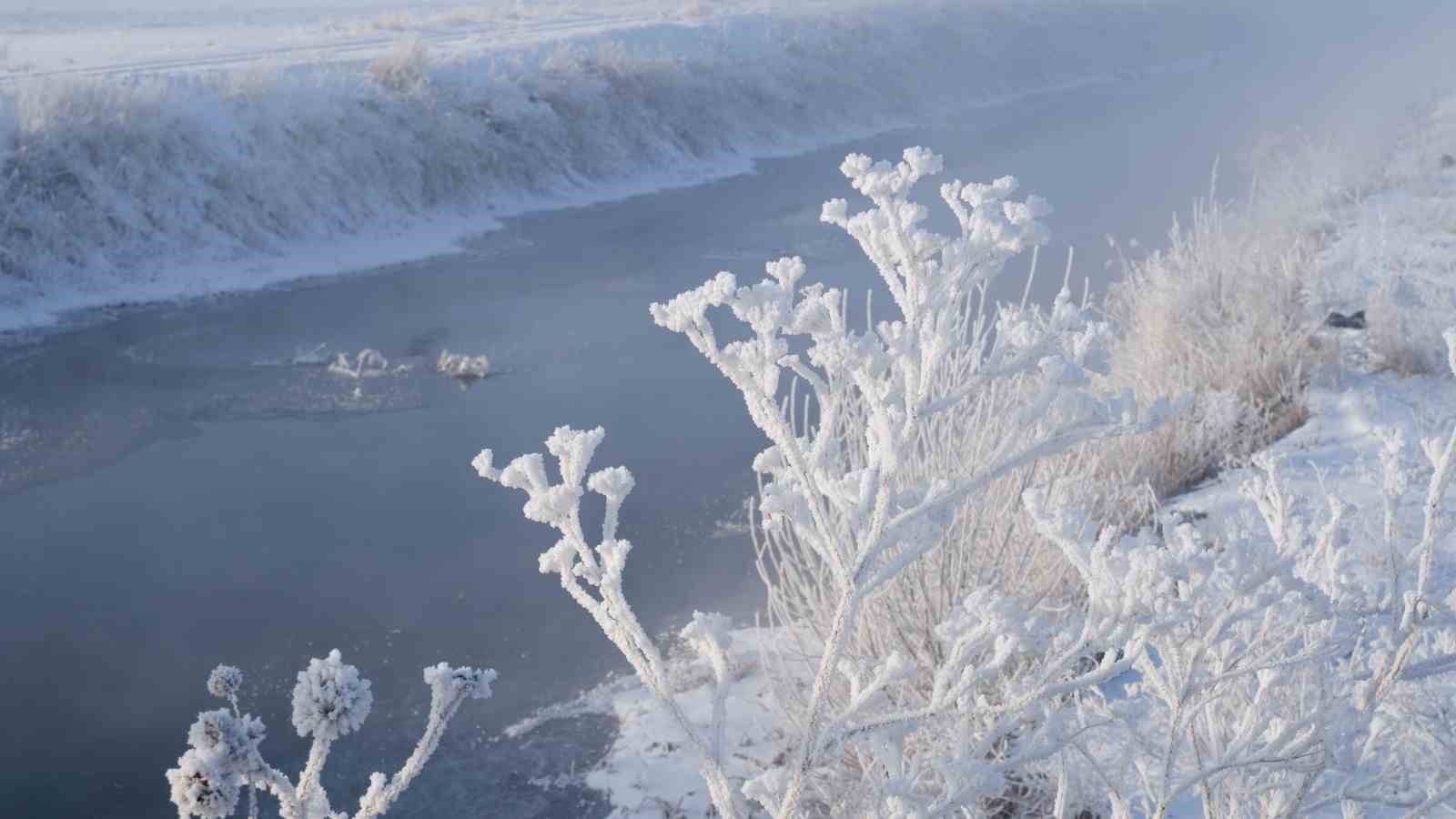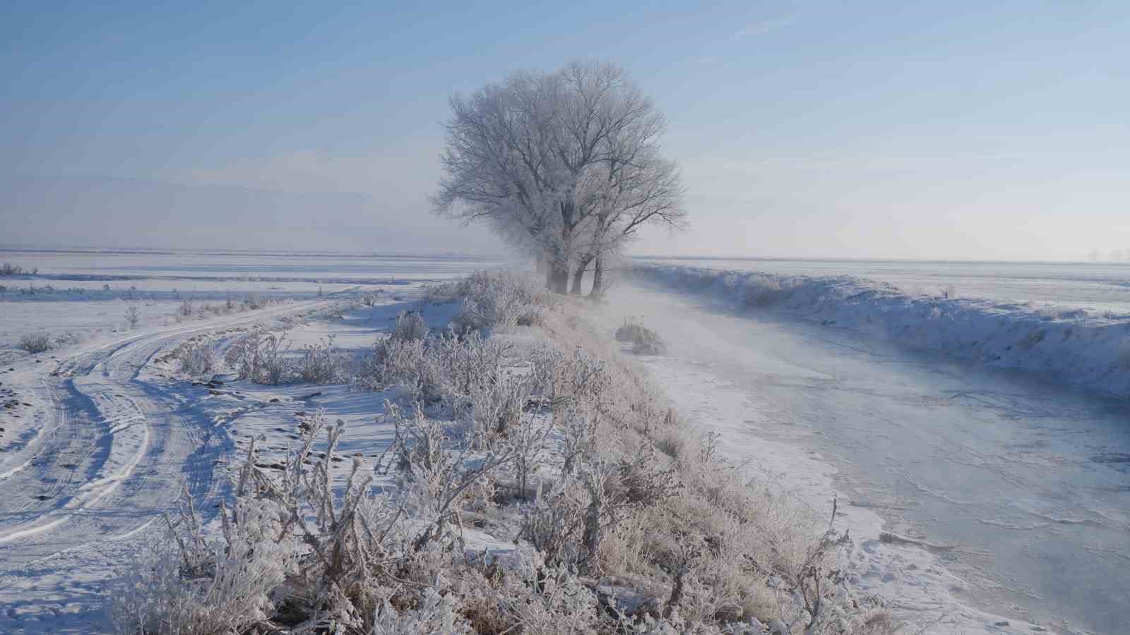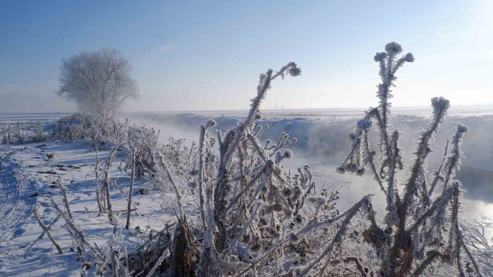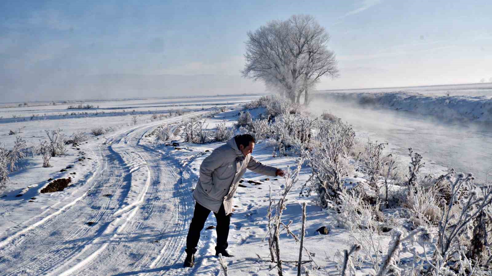 Termometrelerin-20’nin altına düştüğü Erzurum’da ağaçlar kırağından beyaza büründü, Karasu’nun yüzeyi dondu.